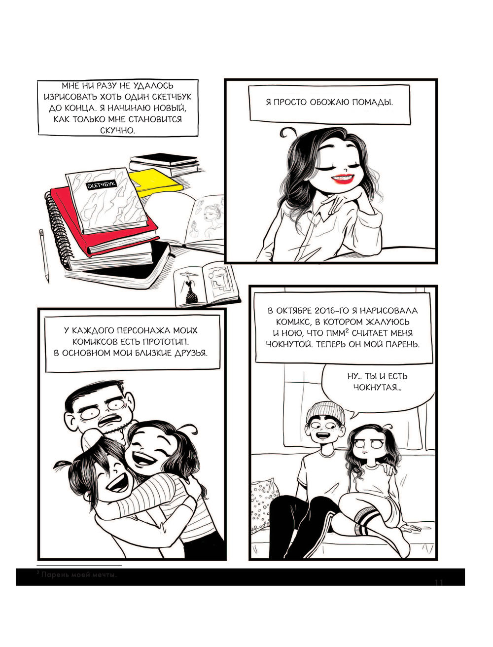 Умение Кассандры Калин зарисовывать весёлые моменты повседневной жизни принесло ей всемирный успех и огромное количество подписчиков по всему миру. В этой книге вы не только найдёте коллекцию её самых любимых комиксов и иллюстраций, но и получите уникальную возможность заглянуть за кулисы: как от порчи родительской мебели художница перешла к зарисовкам той самой девушки – с непослушными волосами и большими надеждами, – которая продолжает набирать популярность по сей день.