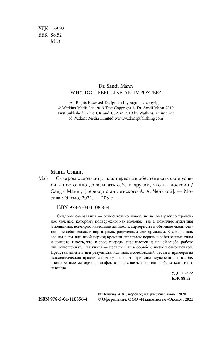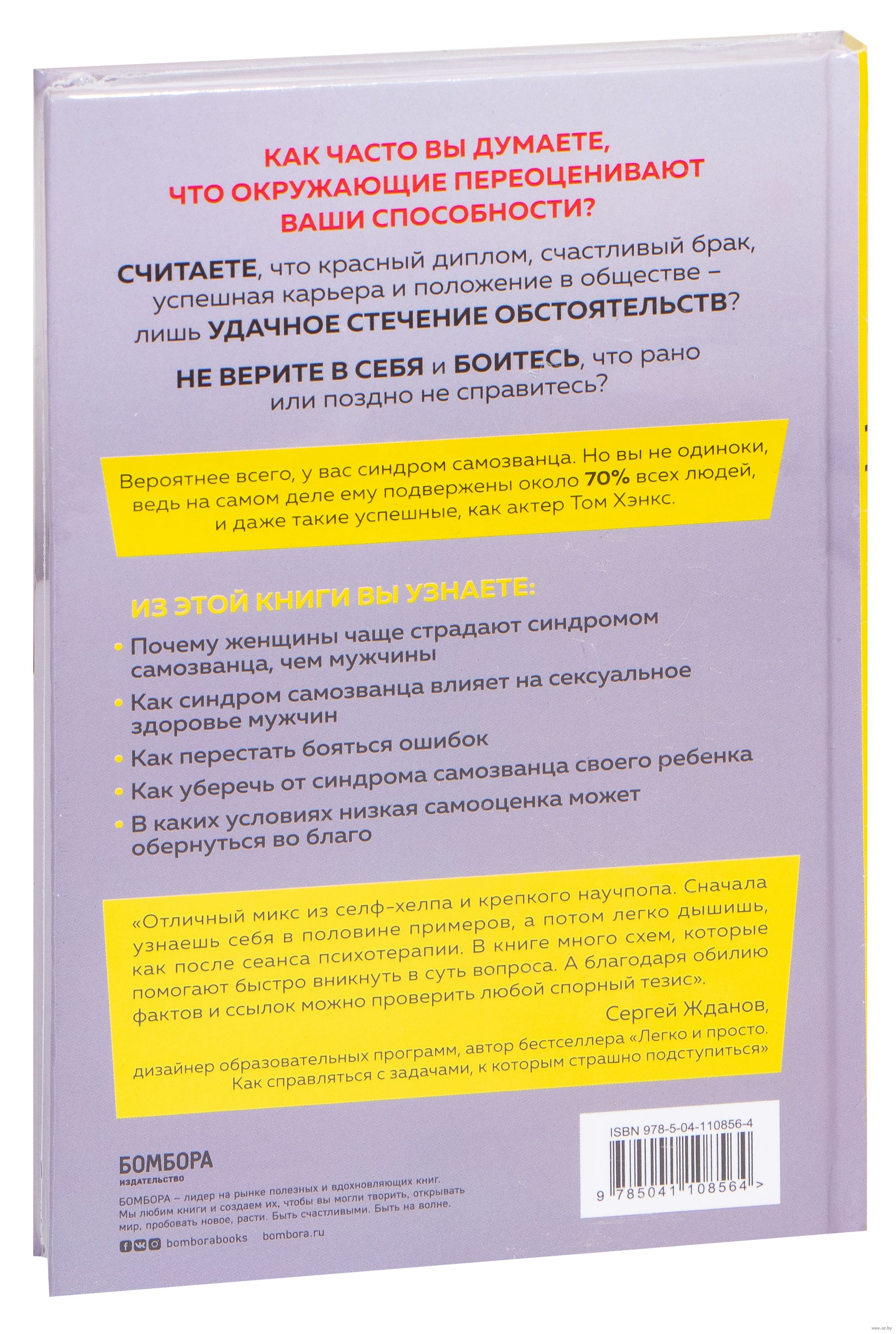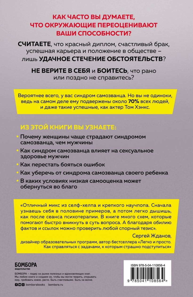 Синдром самозванца – относительно новое, но весьма распространённое явление, которому подвержены как молодые, так и пожилые мужчины и женщины, всемирно известные личности, карьеристы и обычные люди, считающие себя плохими партнёрами, родителями или друзьями. К сожалению, все мы в тот или иной период времени перестаём верить в собственные силы и компетентность, что в свою очередь сказывается на нашей учёбе, работе или отношениях. Эта книга – первый шаг в борьбе с низкой самооценкой. Представленные в ней результаты научных исследований, тесты и примеры из психологической практики помогут осознать причины неуверенности в себе, а конкретные методики и эффективные советы позволят избавиться от неё навсегда.