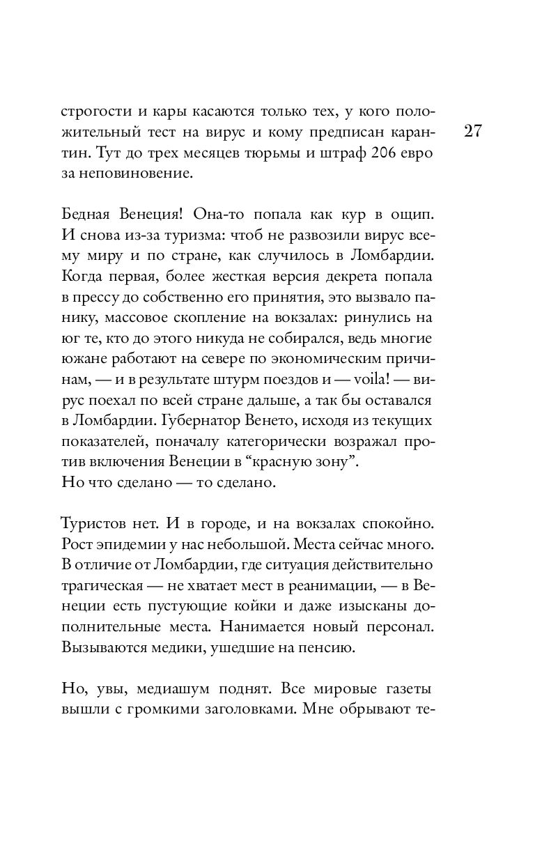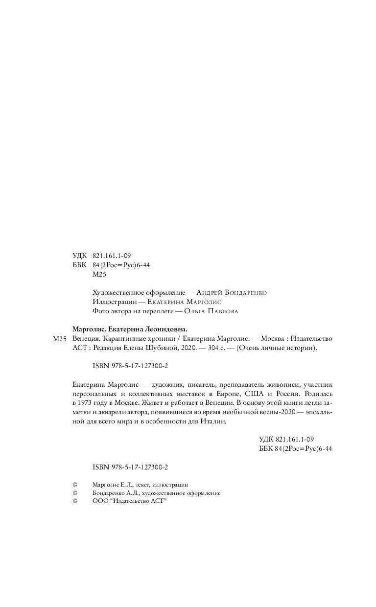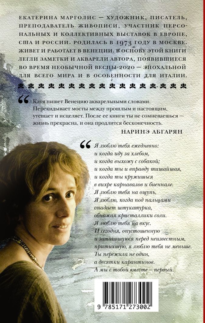 Екатерина Марголис – художник, писатель, преподаватель живописи, участник персональных и коллективных выставок в Европе, США и России. Родилась в 1973 году в Москве. Живёт и работает в Венеции. В основу этой книги легли заметки и акварели автора, появившиеся во время необычной весны-2020 – эпохальной для всего мира и в особенности для Италии.