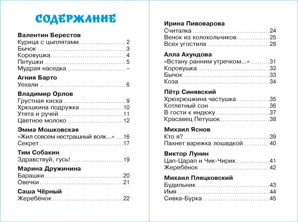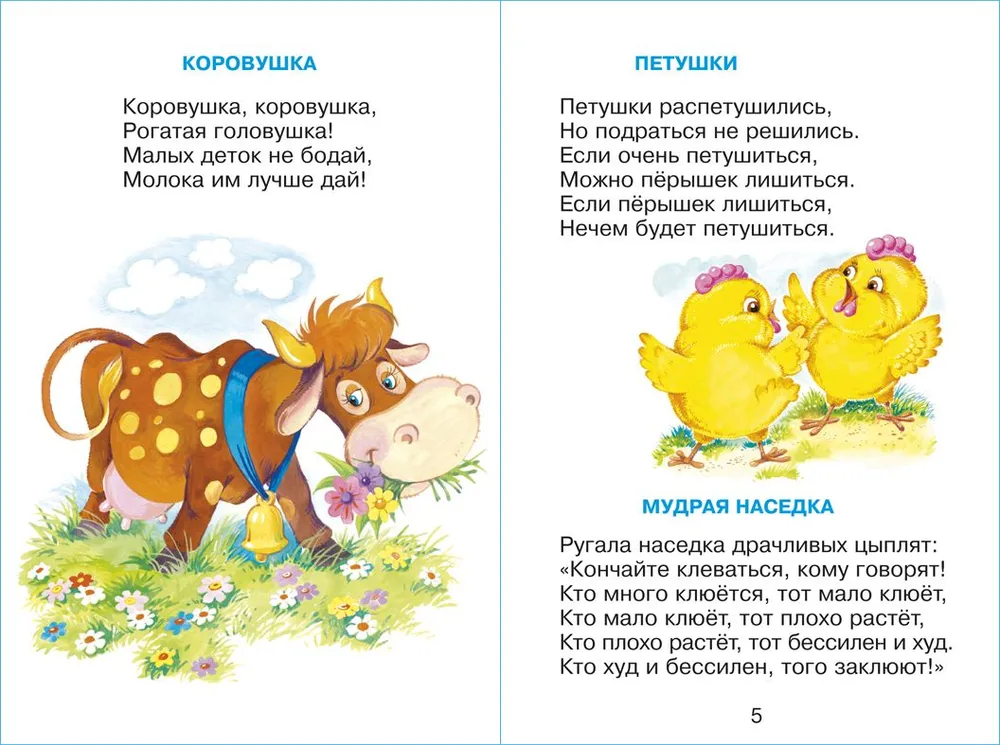 "Петушки", "Коровушка", "Жеребенок", "Барашки", "Гусь" и др. произведения известных детских писателей познакомят ваших детей с миром домашних животных и птиц. А прекрасно выполненные иллюстрации помогут ребенку представить его себе.