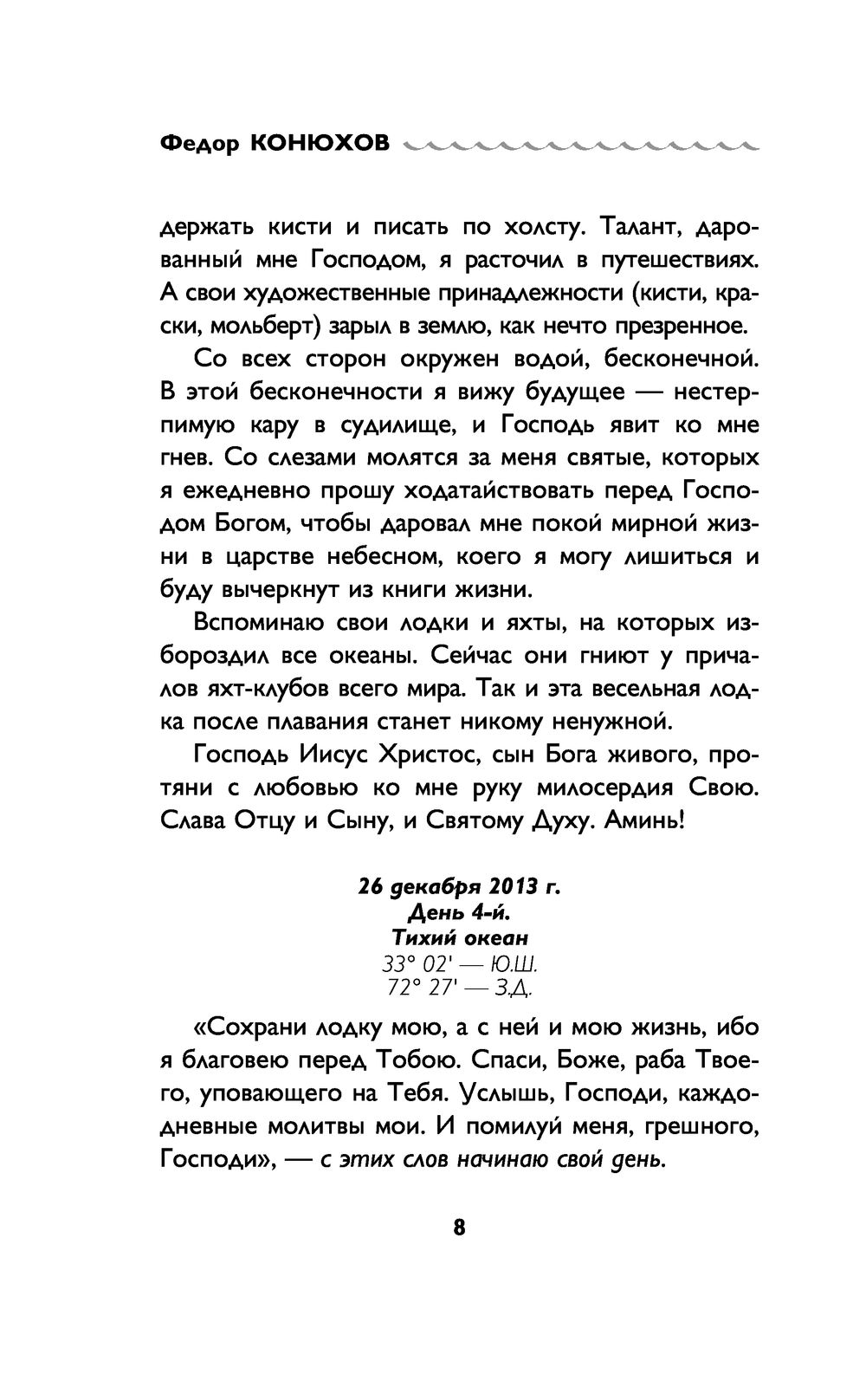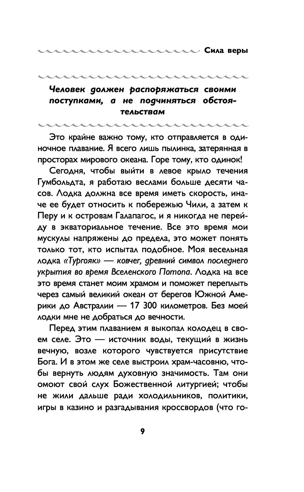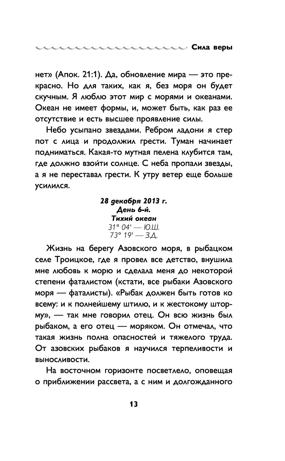 Легендарный российский путешественник Фёдор Конюхов стал первым человеком на планете, которому удалось пересечь на вёслах Южный Тихий океан "от континента до континента". 160 дней и ночей борьбы, испытаний, невероятного упорства и удивительной выдержки – один на один с Океаном! О чем размышляет человек, в одиночестве пересекающий Тихий океан на весельной лодке? Каким святым он молится? С какими словами обращается к сыновьям и внукам? Как преодолевает страх и сомнения? В чем черпает силы и решимость продолжать путь, несмотря на смертельную усталость и опасности? Что такое счастье по мнению одного из самых известных путешественников планеты? В книге "Сила веры" Федор исповедуется нам об этом путешествии, о своих мыслях и чувствах, об истинах, которые он нашел в своей вере и в Боге. Свобода без границ, доступная только в таком путешествии, позволила Федору Конюхову открыть уникальный путь самопознания, чтобы каждый из нас открыл для Бога свою душу и нашел его там.