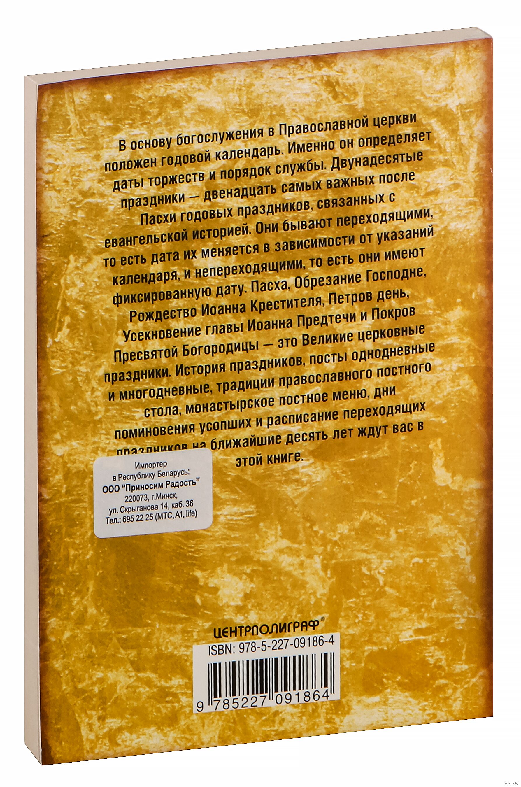 В основу богослужения в Православной церкви положен годовой календарь. Именно он определяет даты торжеств и порядок службы. Двунадесятые праздники – двенадцать самых важных после Пасхи годовых праздников, связанных с евангельской историей. Они бывают переходящими, то есть дата их меняется в зависимости от указаний календаря, и непереходящими, то есть они имеют фиксированную дату. Пасха, Обрезание Господне, Рождество Иоанна Крестителя, Петров день, Усекновение главы Иоанна Предтечи и Покров Пресвятой Богородицы – это Великие церковные праздники. История праздников, посты однодневные и многодневные, традиции православного постного стола, монастырское постное меню, дни поминовения усопших и расписание переходящих праздников на ближайшие десять лет ждут вас в этой книге.