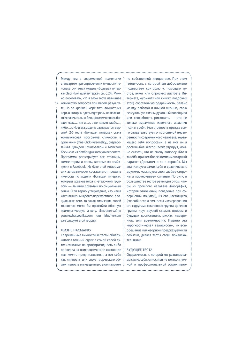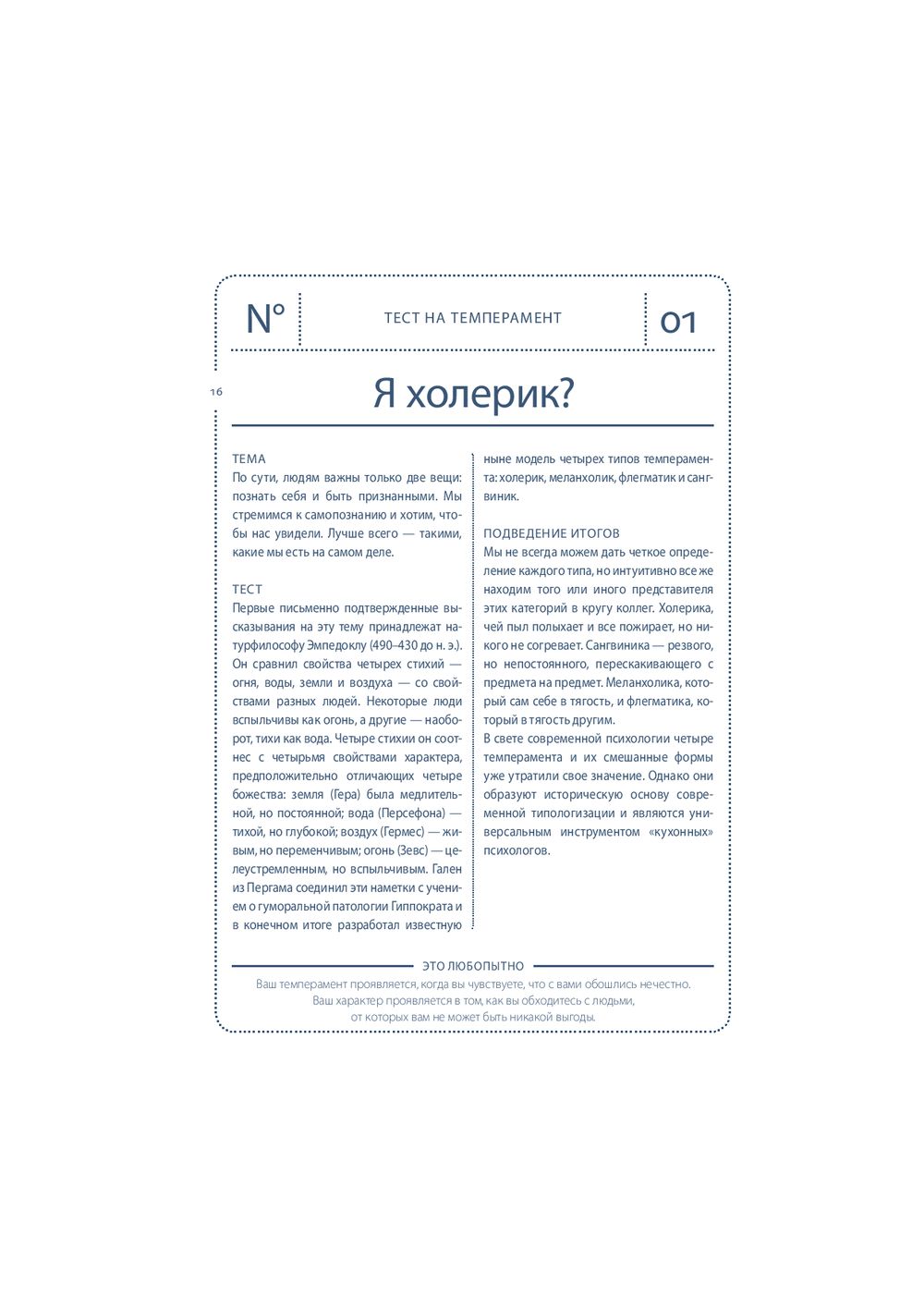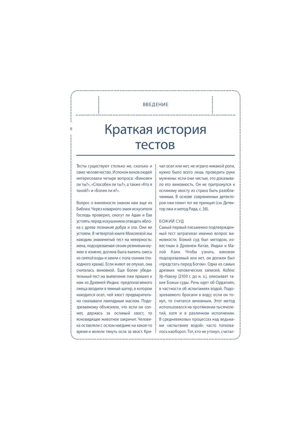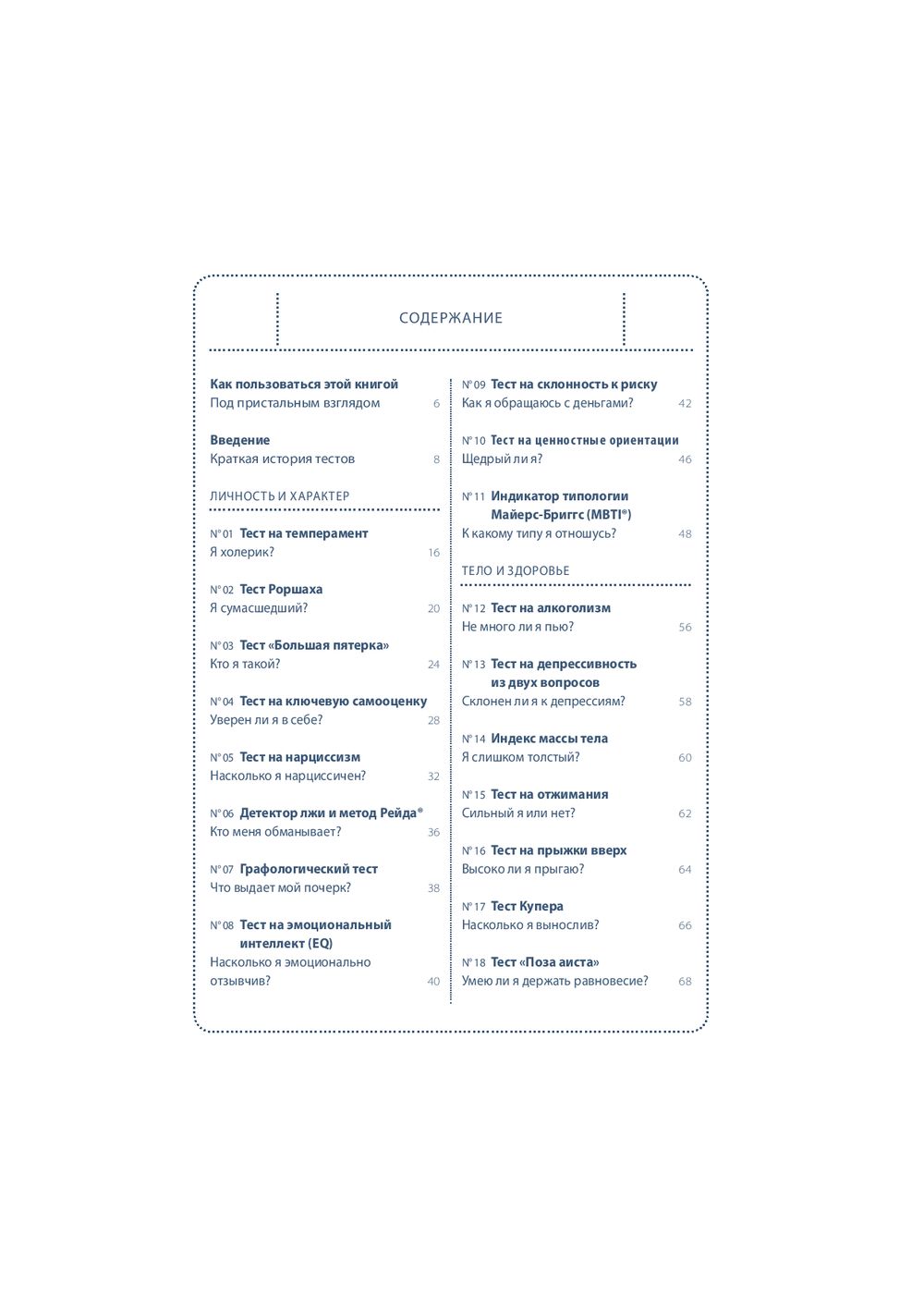 Собранные под обложкой этой книги 64 теста посвящены вам и вашей жизни. "Книгу тестов" можно открыть в любом месте, начать читать с любой страницы, отложить – а затем снова вернуться к интересующему вас тесту. Одни тесты можно пройти сразу и тут же получить ответ на вопросы: "Правильно ли я выбрал профессию?", "Насколько хорошо я знаю своего партнера?". Другие тесты помогут настроиться на нужный лад и лучше узнать себя (тест на детекторе лжи, тест Роршаха, тест GMAT). С помощью этой книги вы сможете оценить свои способности, физическую подготовку и стрессоустойчивость; выяснить, к какому типу личности вы относитесь и насколько сильны в вас лидерские качества; проанализировать различные стороны вашей жизни и даже определить примерную дату вашей смерти. Каждый тест сопровождается экскурсом в его историю и происхождение.