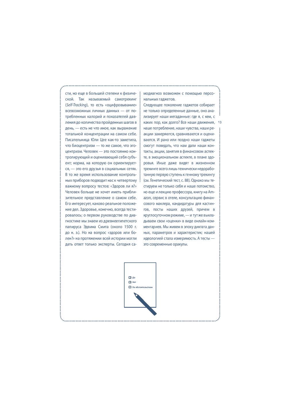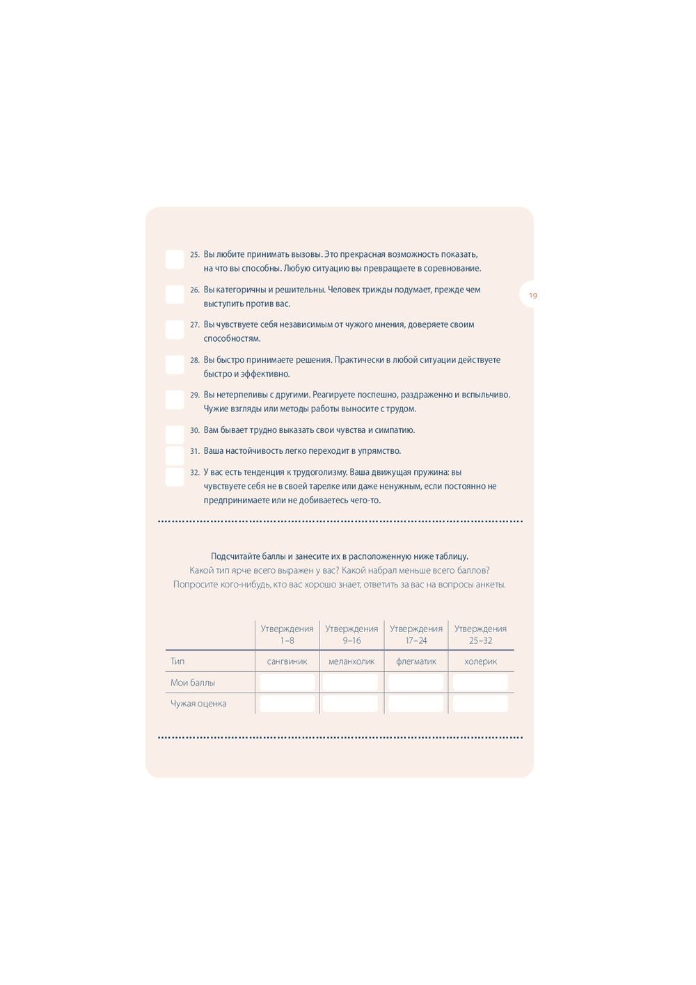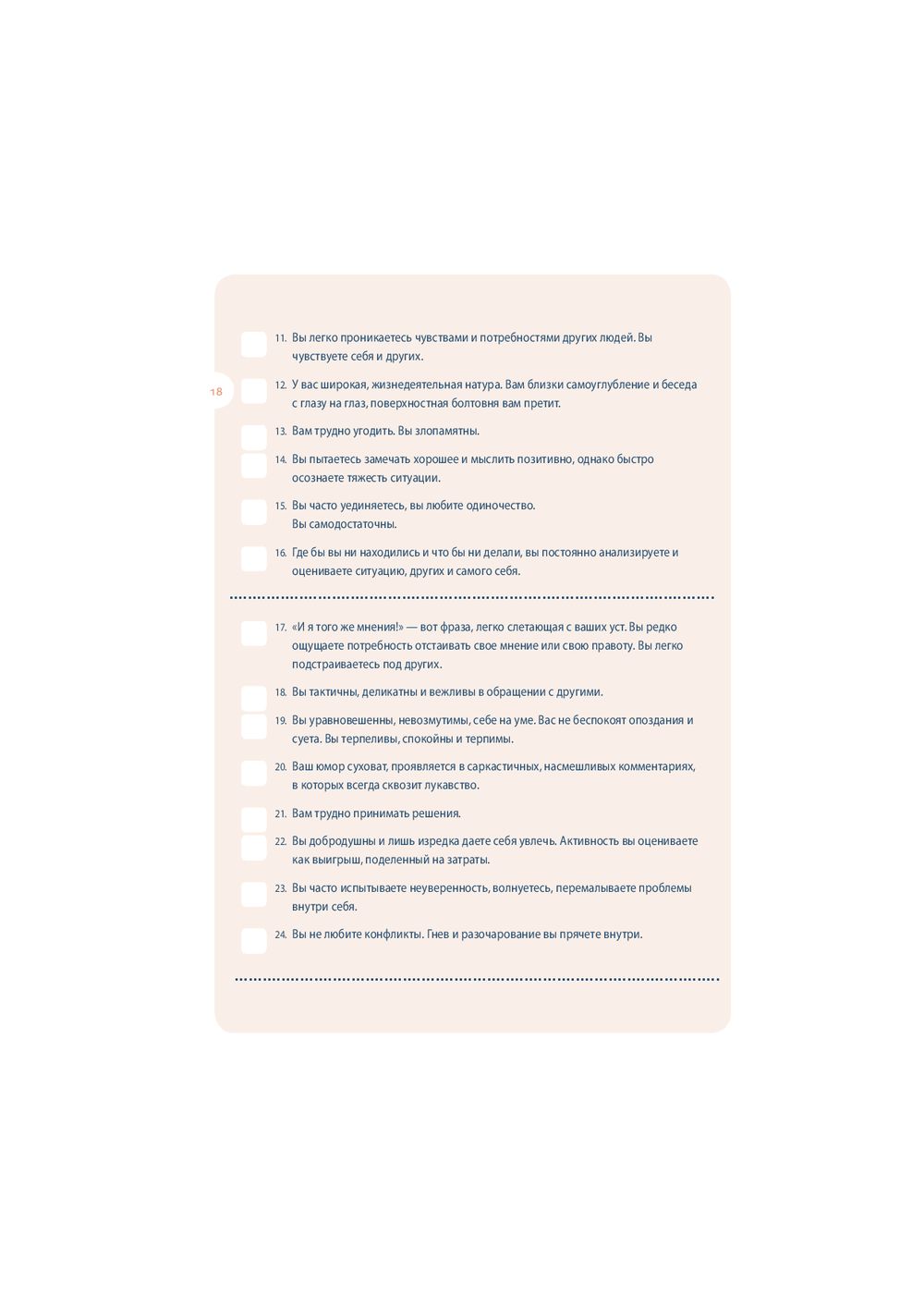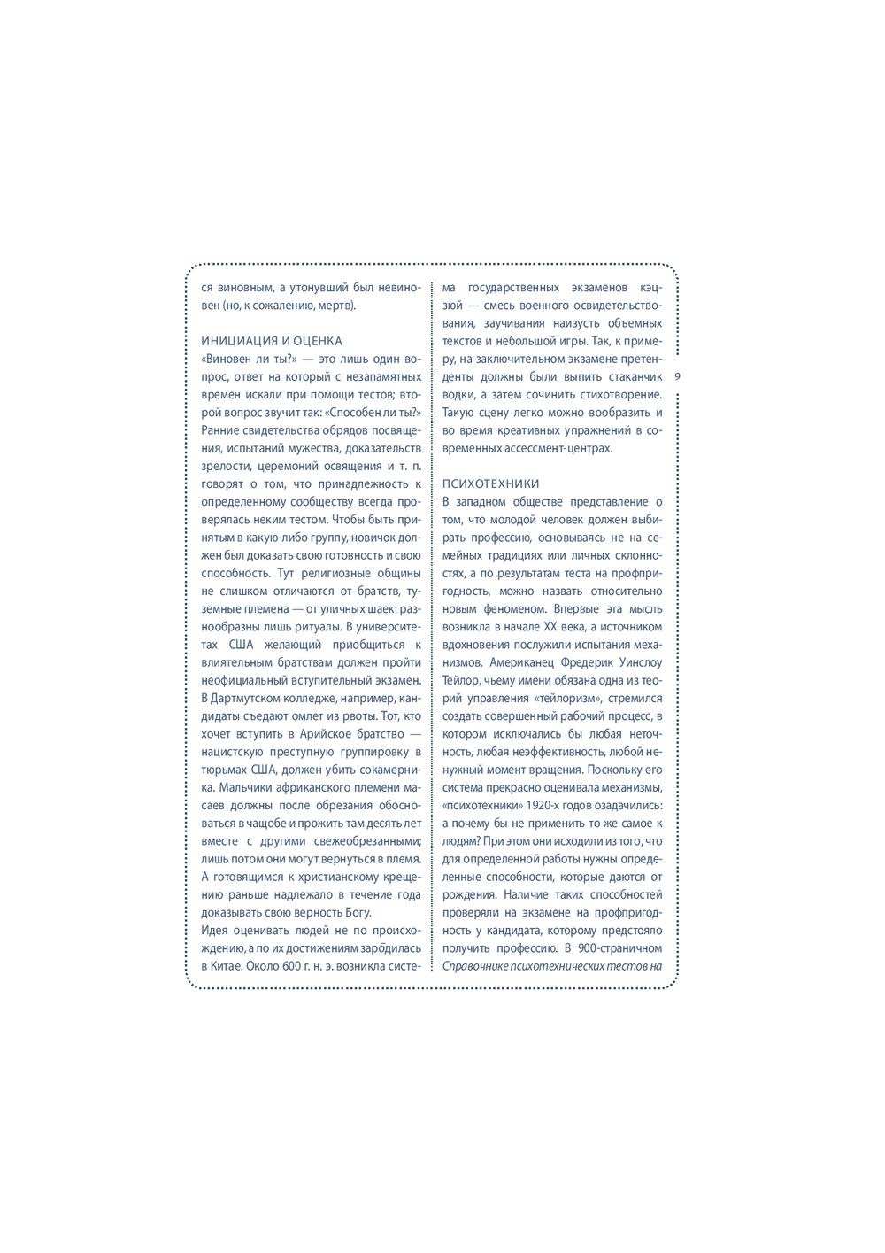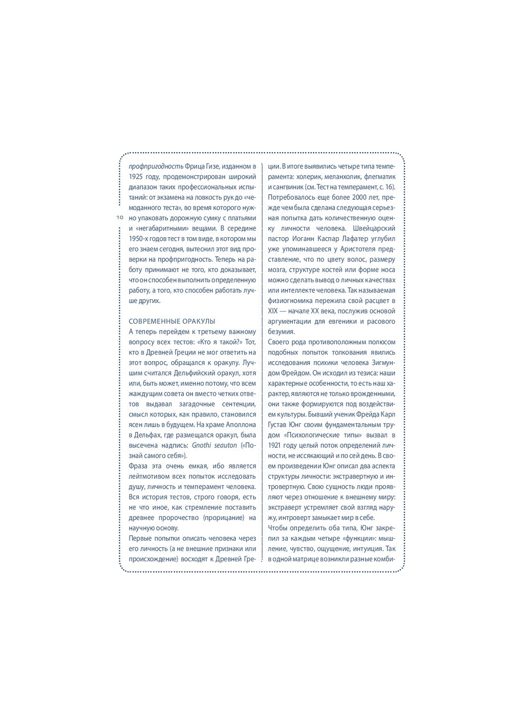 Собранные под обложкой этой книги 64 теста посвящены вам и вашей жизни. "Книгу тестов" можно открыть в любом месте, начать читать с любой страницы, отложить – а затем снова вернуться к интересующему вас тесту. Одни тесты можно пройти сразу и тут же получить ответ на вопросы: "Правильно ли я выбрал профессию?", "Насколько хорошо я знаю своего партнера?". Другие тесты помогут настроиться на нужный лад и лучше узнать себя (тест на детекторе лжи, тест Роршаха, тест GMAT). С помощью этой книги вы сможете оценить свои способности, физическую подготовку и стрессоустойчивость; выяснить, к какому типу личности вы относитесь и насколько сильны в вас лидерские качества; проанализировать различные стороны вашей жизни и даже определить примерную дату вашей смерти. Каждый тест сопровождается экскурсом в его историю и происхождение.