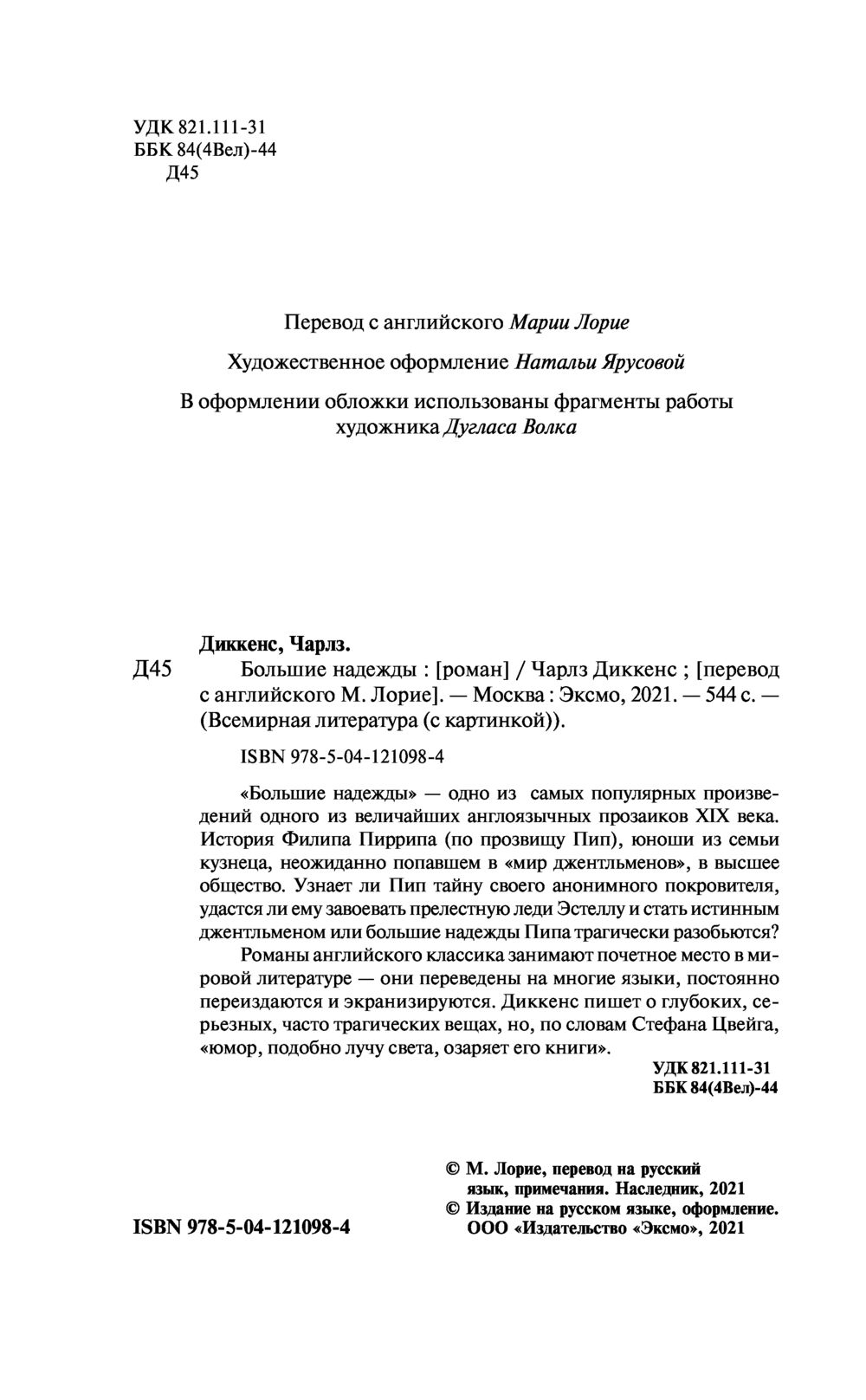 "Большие надежды" – одно из самых популярных произведений одного из величайших англоязычных прозаиков XIX века. История Филипа Пиррипа (по прозвищу Пип), юноши из семьи кузнеца, неожиданно попавшем в "мир джентльменов", в высшее общество. Узнает ли Пип тайну своего анонимного покровителя, удастся ли ему завоевать прелестную леди Эстеллу и стать истинным джентльменом или большие надежды Пипа трагически разобьются? Романы английского классика занимают почетное место в мировой литературе – они переведены на многие языки, постоянно переиздаются и экранизируются. Диккенс пишет о глубоких, серьезных, часто трагических вещах, но, по словам Стефана Цвейга, "юмор, подобно лучу света, озаряет его книги".