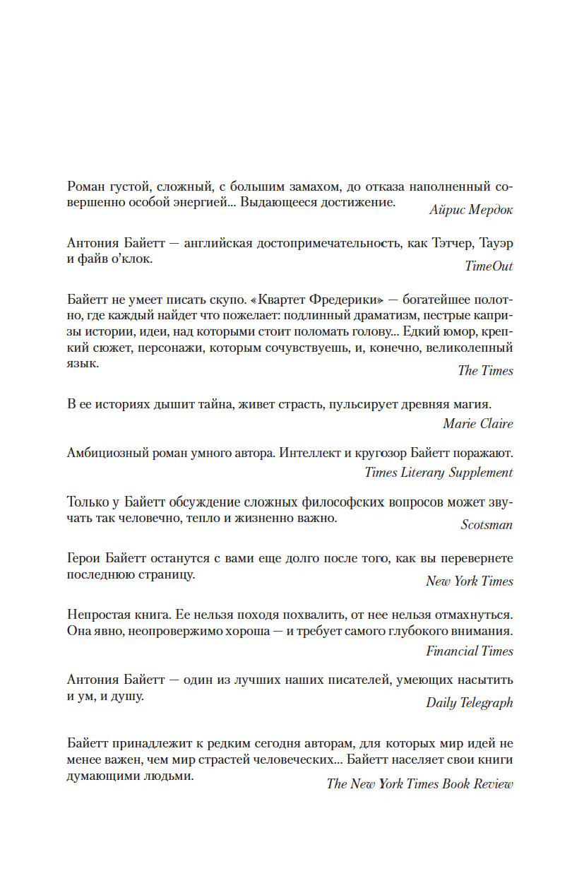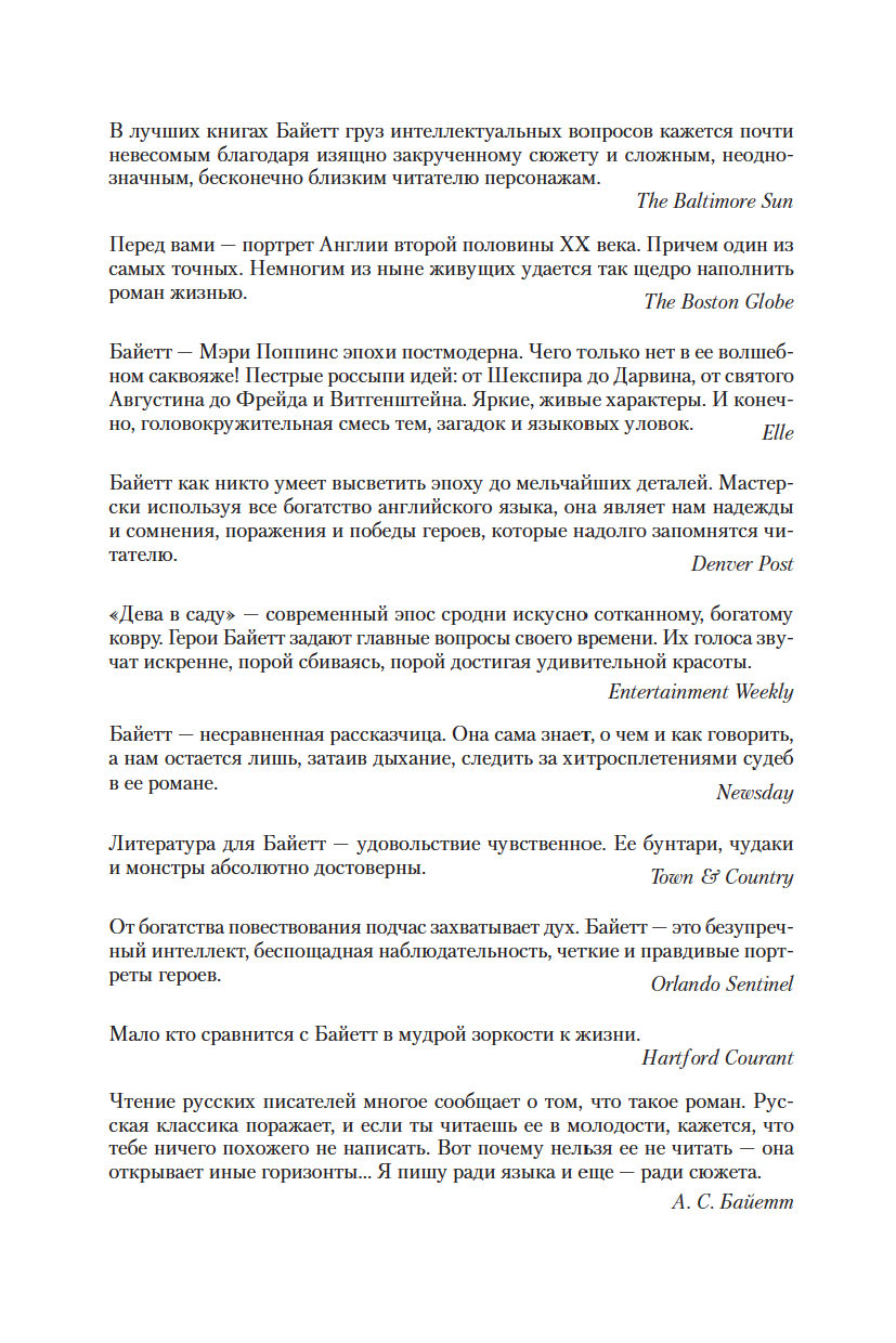 "Дева в саду" – современный эпос сродни искусно сотканному, богатому ковру. Герои Байетт задают главные вопросы своего времени. Их голоса звучат искренне, порой сбиваясь, порой достигая удивительной красоты" (Entertainment Weekly).