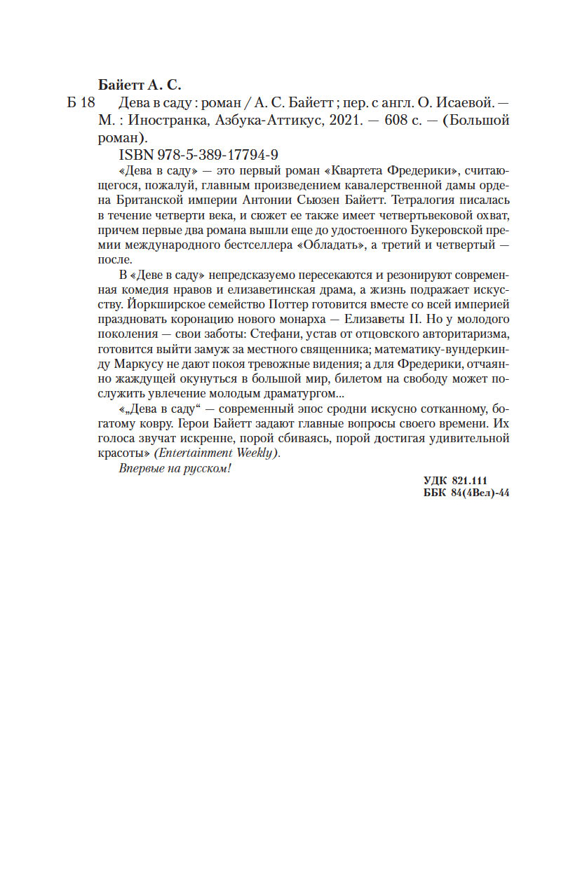 "Дева в саду" – это первый роман "Квартета Фредерики", считающегося, пожалуй, главным произведением кавалерственной дамы Ордена Британской империи Антонии Сьюзен Байетт. Тетралогия писалась в течение четверти века, и сюжет ее также имеет четвертьвековой охват, причем первые два романа вышли еще до удостоенного Букеровской премии международного бестселлера "Обладать", а третий и четвертый – после.