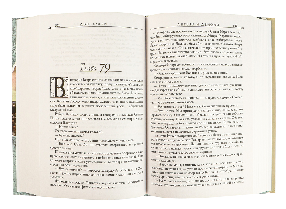 По-моему это лучшее из произведений Д.Брауна.Интересная задумка, захватывающий сюжет, точное, подробное и красочное описание Рима (если всё это видел и ориентируешься в городе, ощущение такое, что участвуешь в событиях) Единственный минус - это то, что по мнению Брауна (как впрочем всех американцев) именно АМЕРИКАНЕЦ способен распутывать сложные клубки, проявлять чудеса смекалки и образованности, как будто другим это не под силу. Если бы Браун сделал своим главным героем местного учёного, думаю книга бы пользовалась гораздо большим успехом во всём мире,потому что от неё не "несло бы американщиной". Я прочла эту книгу первой, "Код да Винчи" мне тоже очень понравился(за исключением того , что я не ориентируюсь в Париже и Лондоне так же как в Риме), "Цифровая крепость" интересна, но лишена романтики и красоты, сухие события, как язык цифр в статистике, а "Точка обмана" особо не "цепляет" и очень предсказуема(хотя может быть это потому, что до неё было прочитано три книги, по большому счёту написанные по одному и тому же алгоритму - наверное надо было читать всё в обратном порядке)