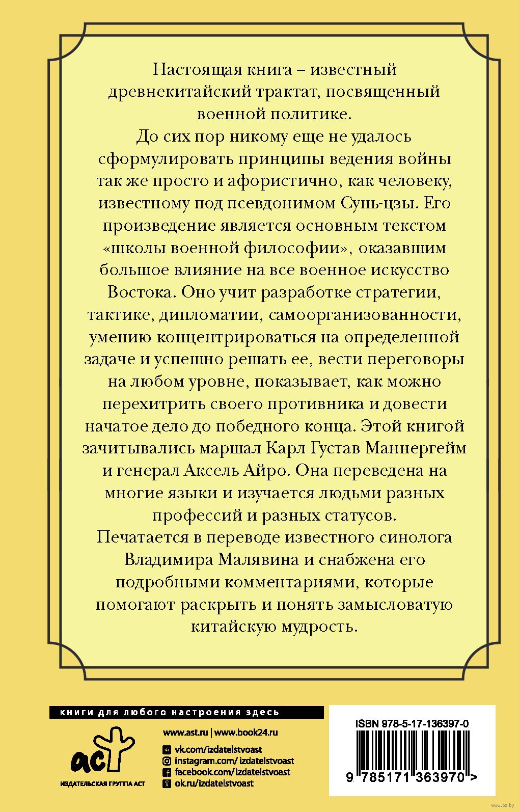 Оно учит разработке стратегии, тактике, дипломатии, самоорганизованности, умению концентрироваться на определенной задаче и успешно решать ее, вести переговоры на любом уровне, показывает, как можно перехитрить своего противника и довести начатое дело до победного конца. Этой книгой зачитывались маршал Карл Густав Маннергейм и генерал Аксель Айро. Она переведена на многие языки и изучается людьми разных профессий и разных статусов.