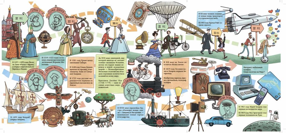 Необычные факты удивят не только детей, но и взрослых. Каждый разворот можно долго разглядывать, находя все новые интересные детали. А в длинной вклейке на несколько сложений можно за пять минут пройти всю историю человечества. Все это поможет оживить и систематизировать знания, привить или возродить интерес к истории.