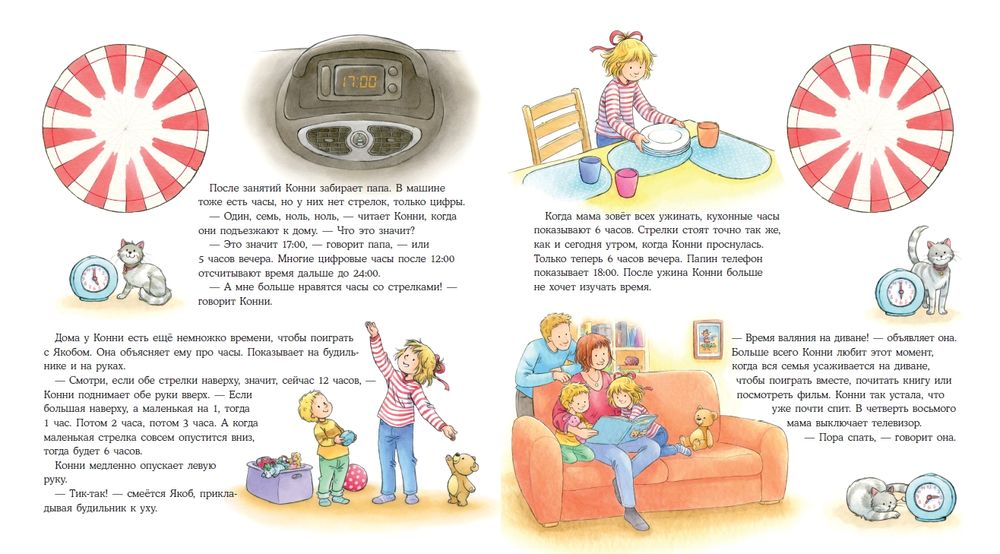 Бабушка подарила Конни будильник, и теперь её любимое занятие – определять время. Интересно, почему большая стрелка двигается быстрее, чем маленькая? А четверть часа – это сколько? И что можно успеть сделать за секунду?