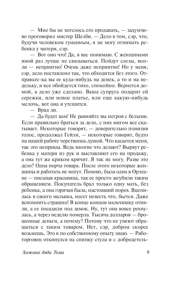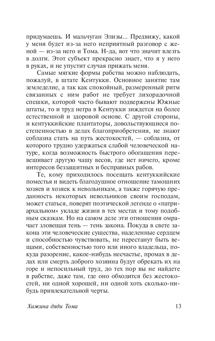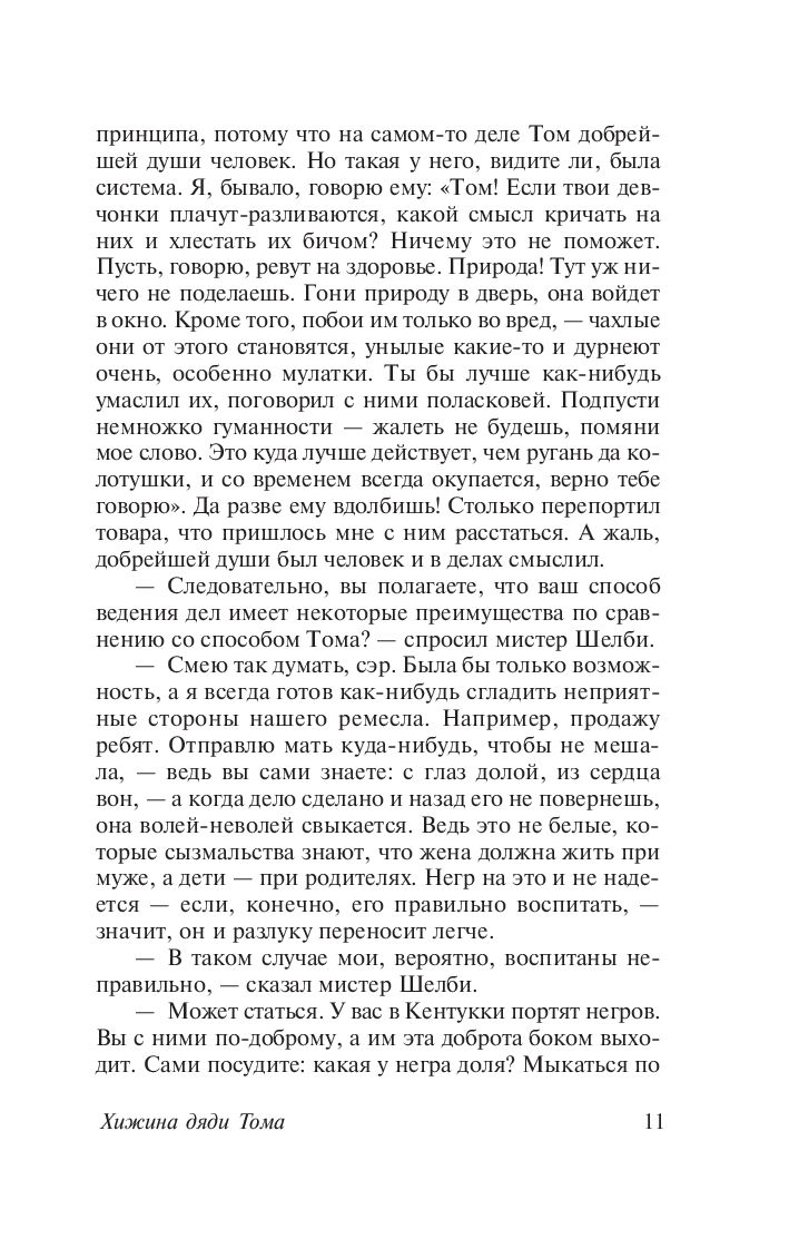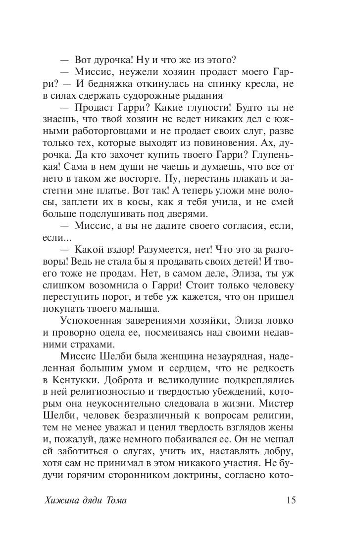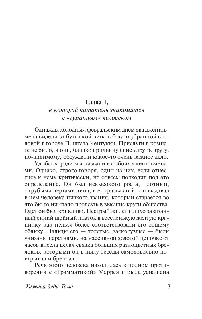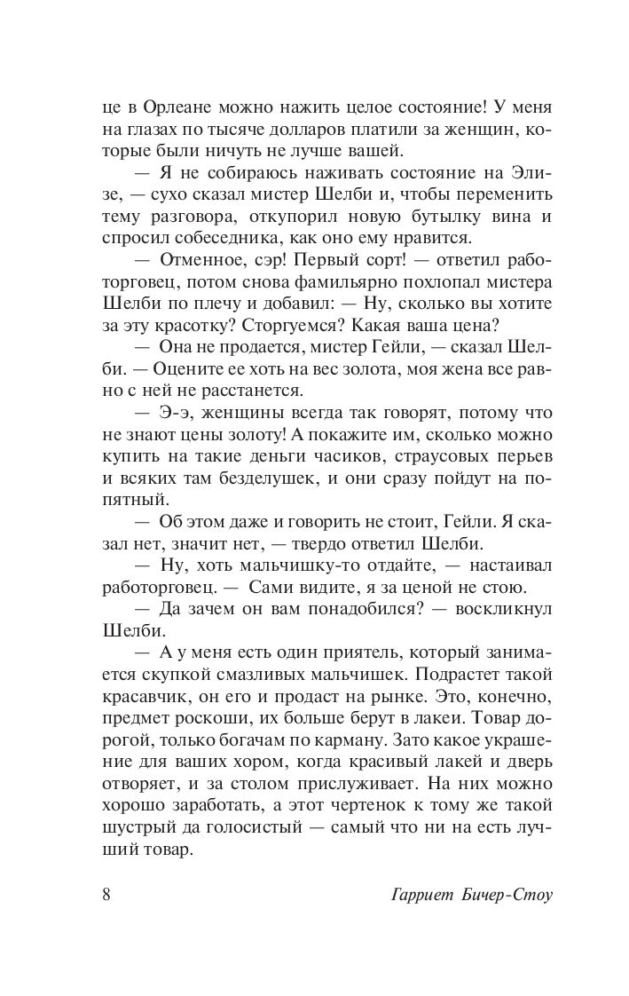 Возраст этой книги подбирается уже ко второму столетию, но современный читатель и теперь, как и когда-то, сострадает горестной судьбе доброго и честного чернокожего дяди Тома и с замиранием сердца следит за опасными приключениями красавицы-квартеронки Элизы и ее отважного мужа Джорджа, решившихся, рискуя жизнью, бежать и пуститься через всю страну в далекий путь в Канаду, чтобы спасти от ужасной участи своего маленького сына Гарри...