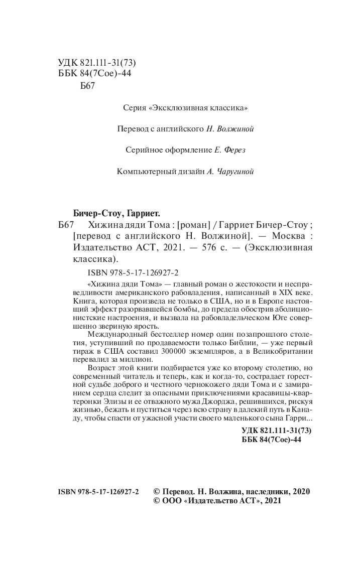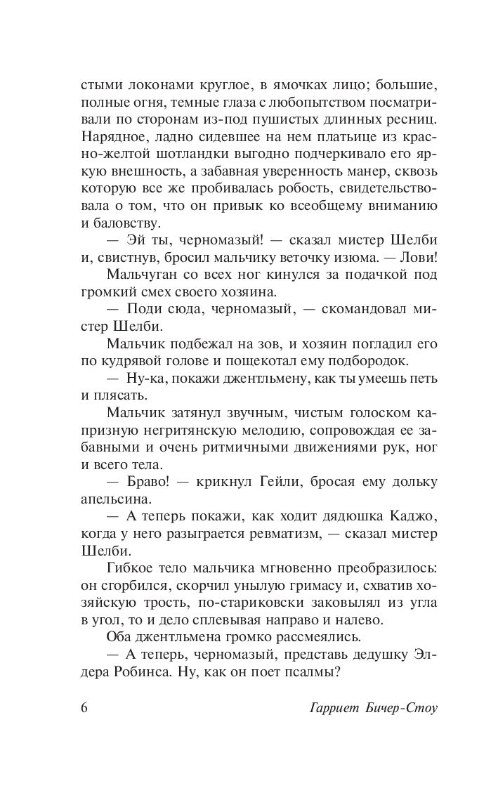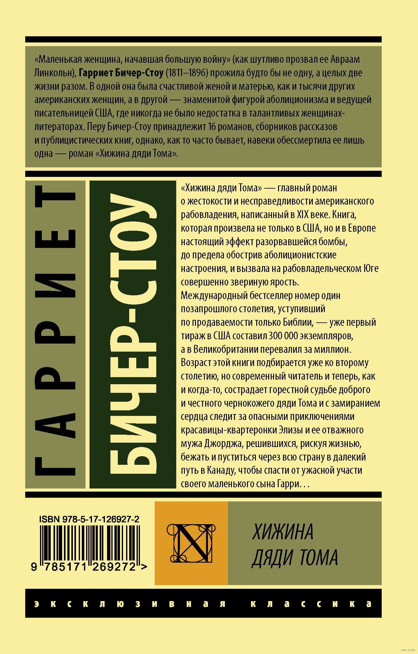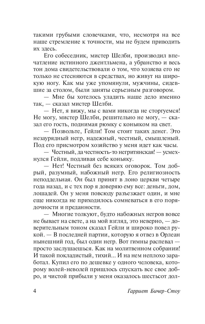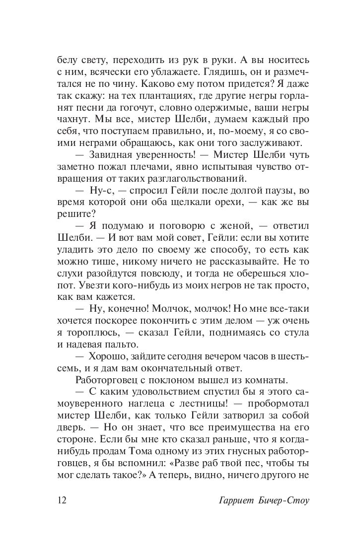 Возраст этой книги подбирается уже ко второму столетию, но современный читатель и теперь, как и когда-то, сострадает горестной судьбе доброго и честного чернокожего дяди Тома и с замиранием сердца следит за опасными приключениями красавицы-квартеронки Элизы и ее отважного мужа Джорджа, решившихся, рискуя жизнью, бежать и пуститься через всю страну в далекий путь в Канаду, чтобы спасти от ужасной участи своего маленького сына Гарри...