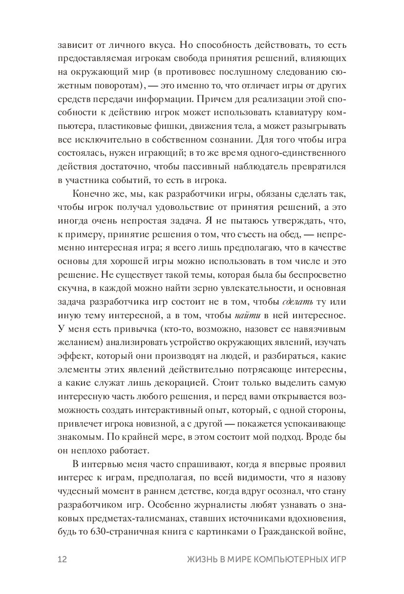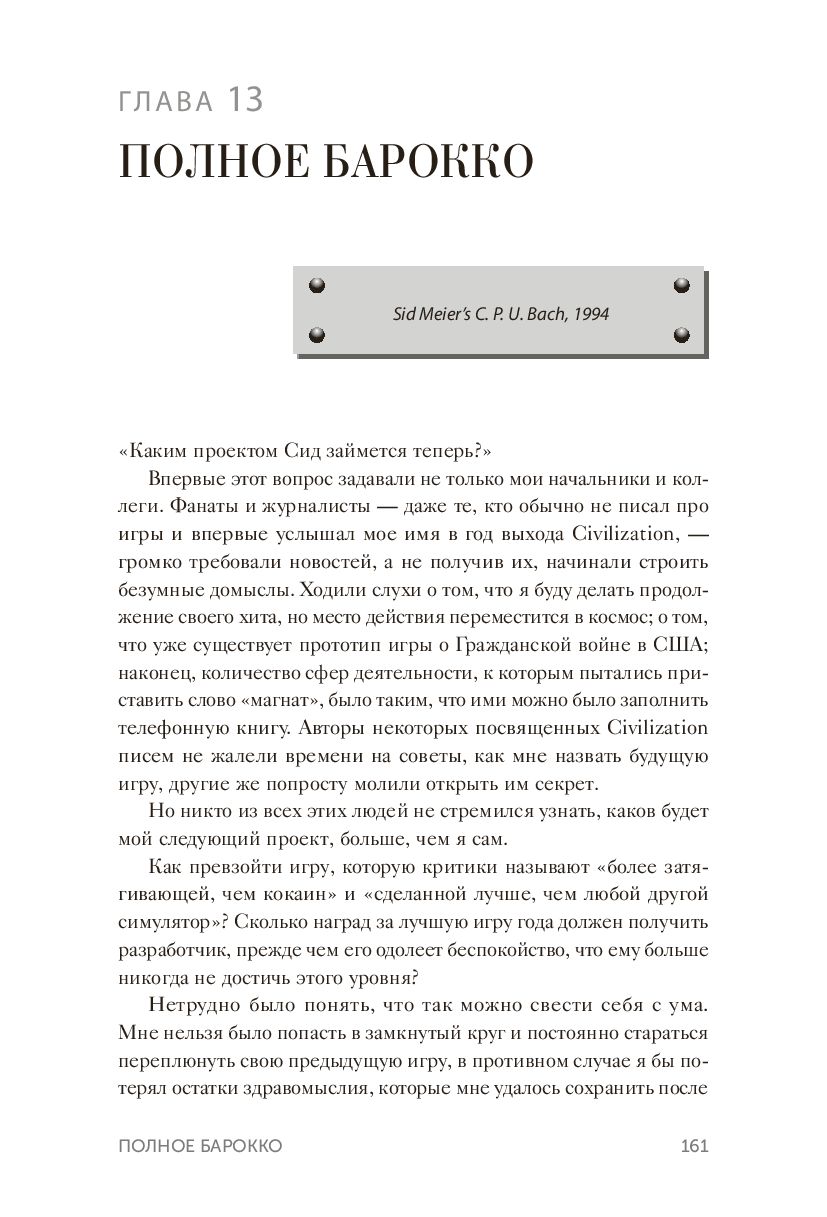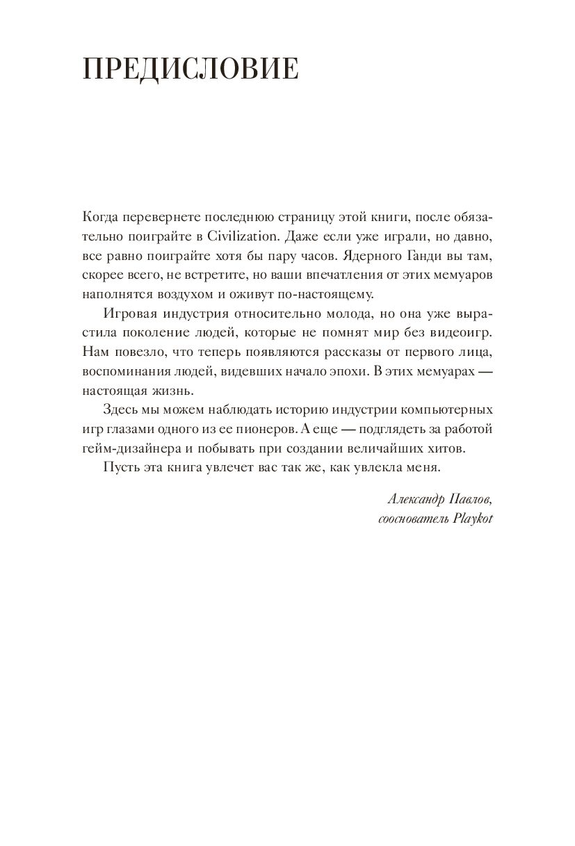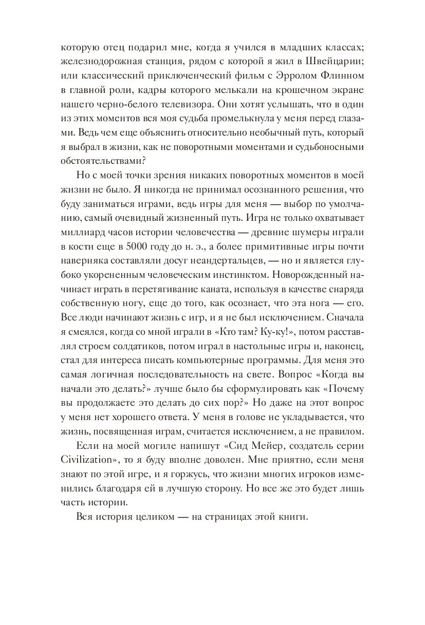 Перед вами история одержимого молодого компьютерного энтузиаста, который помог запустить многомиллиардную индустрию. Сформулировав свою философию ("видеоигра должна быть серией интересных решений"), Мейер делится взглядом на историю индустрии, психологию геймеров и увлекательное понимание творческого процесса, включая собственные правила хорошего игрового дизайна.