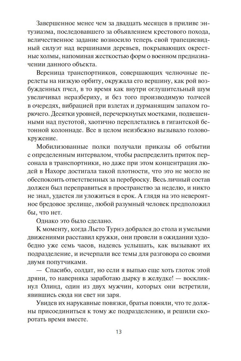 2202 год: на планете Земля после кровопролитной войны, охватившей все континенты, возникает Новая христианская империя. Урбан IX, всемогущий папа, властитель мира, железной рукой правит народами, вернувшимися к средневековому образу жизни. По его приказу космический корабль отправляется к созвездию Центавра в надежде завоевать для человечества новые территории. Новоявленные колонизаторы с удивлением обнаруживают на одной из планет неизвестный народ – атамидов. Но это открытие меркнет по сравнению с еще более ошеломляющей находкой: подлинной гробницей Христа! Посланцы Земли, движимые непоколебимой верой, пытаются завладеть ею, но терпят сокрушительное поражение. В ответ папа Урбан снаряжает гигантский космолет "Святой Михаил", способный перевезти миллион человек. В крестовом походе к новому Иерусалиму принимают участие рыцари-тамплиеры Танкред и Альберик. Найдут ли земляне контакт с атамидами или сметут их цивилизацию с лица планеты? Может ли история повториться?