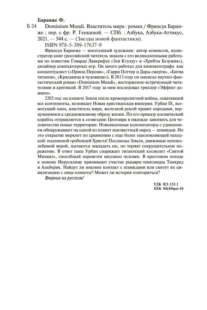 Франсуа Баранже – многоликий художник: автор комиксов, иллюстратор книг (российский читатель знаком с его великолепными работами по повестям Говарда Лавкрафта "Зов Ктулху" и "Хребты Безумия"), дизайнер компьютерных игр. Он много работал для кинематографа как концептуалист ("Принц Персии", "Гарри Поттер и Дары смерти", "Битва титанов", "Красавица и чудовище"). В 2013 году он написал научно-фантастический роман "Dominium Mundi", восторженно встреченный читателями и критикой. В 2017 году за ним последовал триллер "Эффект домино".