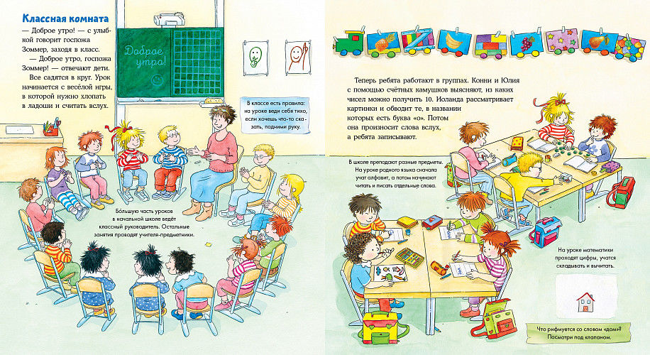 Вместе с Конни ребёнок узнает, как организован школьный день, познакомится с основными предметами и запомнит, что нужно обязательно взять с собой на уроки.