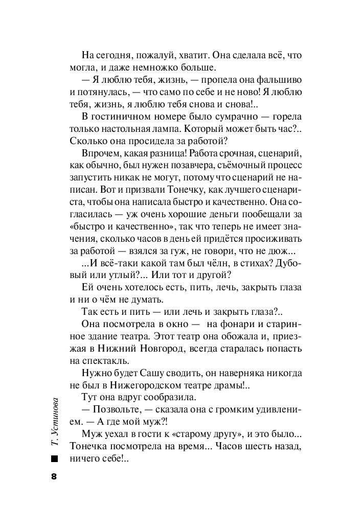 Тонечка – любящая и любимая жена, дочь и мать. Счастливица, одним словом! А еще она известный сценарист и может быть рядом со своим мужем-режиссером всегда и везде – и на работе, и на отдыхе. И живут они душа в душу, и понимают друг друга с полуслова... Или Тонечке только кажется, что это так? Однажды они отправляются в прекрасный старинный город. Её муж Александр должен встретиться с давним другом, которого Тонечка не знает. Кто такой этот Кондрат Ермолаев? Муж говорит – повар, а похоже, что бандит. Во всяком случае, как раз в присутствии столичных гостей его задерживают по подозрению в убийстве жены. Александр явно что-то скрывает, встревоженная Тонечка пытается разобраться в происходящем сама – и оказывается в самом центре детективной истории, сюжет которой ей, сценаристу, совсем непонятен. Ясно одно: в опасности и Тонечка, и ее дети, и идеальный брак с прекрасным мужчиной, который, возможно, не тот, за кого себя выдавал...