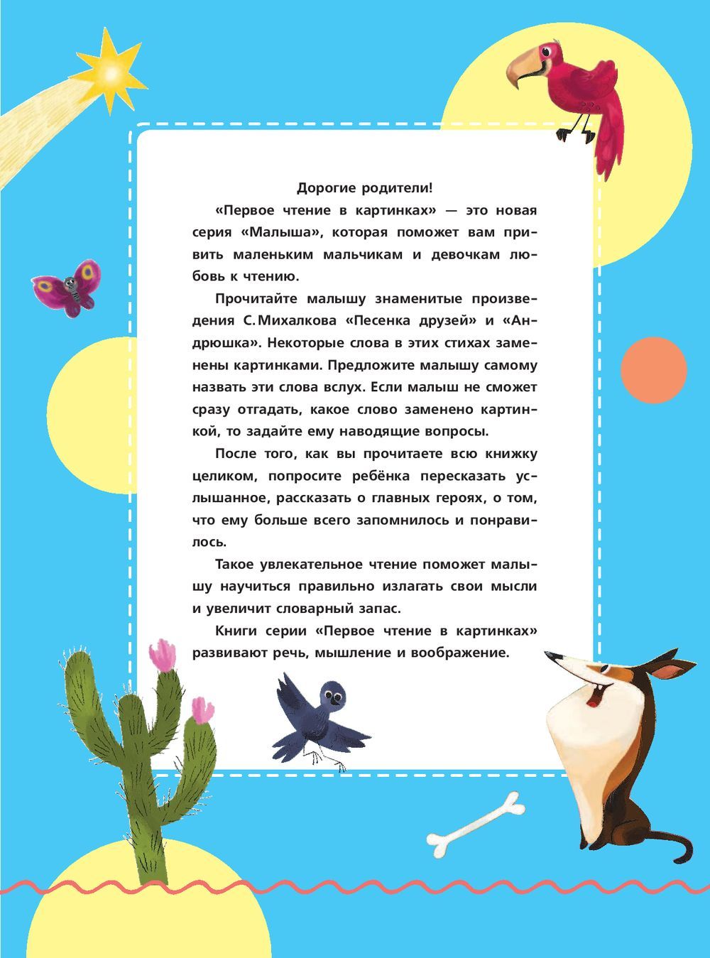 Прочитайте малышам эту песенку и стихотворение «Андрюшка», которое тоже вошло в эту книгу, и попросите их назвать вслух те слова, которые заменены картинками.