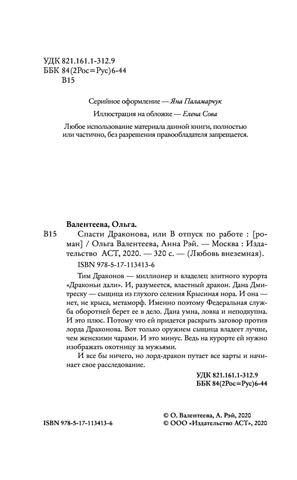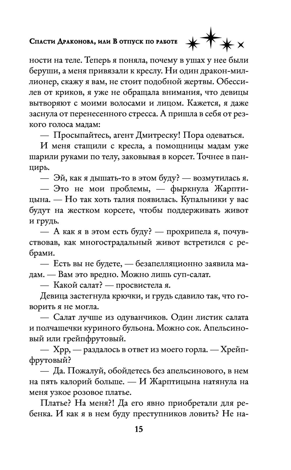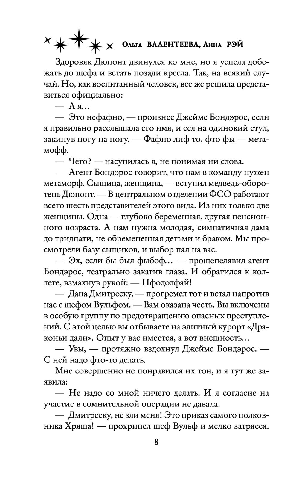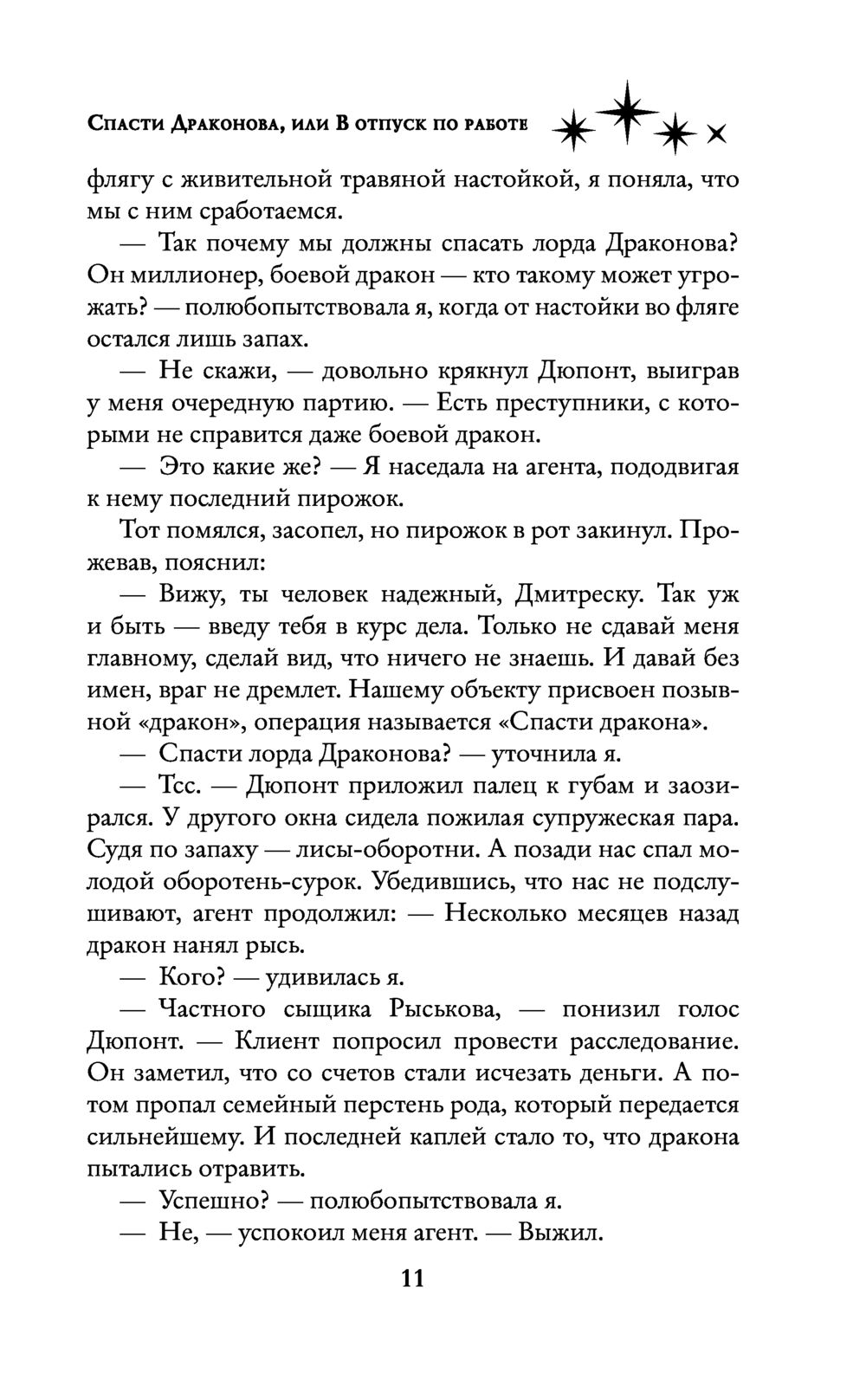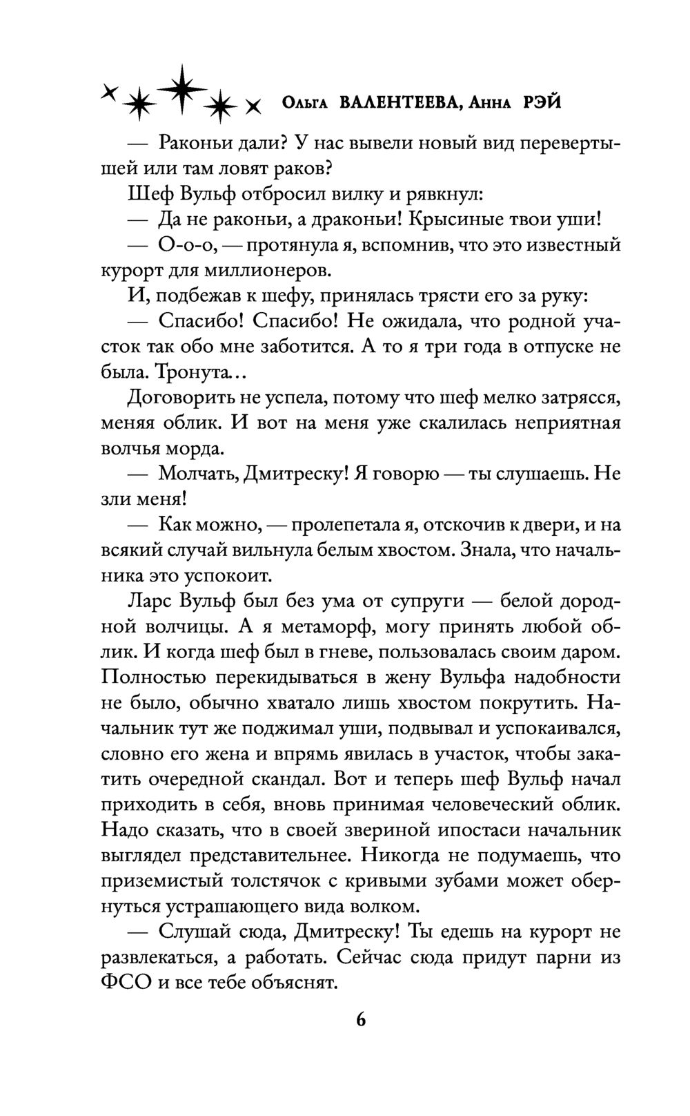Тим Драконов – миллионер и владелец элитного курорта "Драконьи дали". И, разумеется, властный дракон. Дана Дмитреску – сыщица из глухого селения Крысиная нора. И она – нет, не крыса, метаморф. Именно поэтому Федеральная служба оборотней берет ее в дело. Дана умна, ловка и неподкупна. И это плюс. Потому что ей придется раскрыть заговор против лорда Драконова. Вот только оружием сыщица владеет лучше, чем женскими чарами. И это минус. Ведь на курорте ей нужно изображать охотницу за мужьями. И все бы ничего, но лорд-дракон путает все карты и начинает свое расследование.