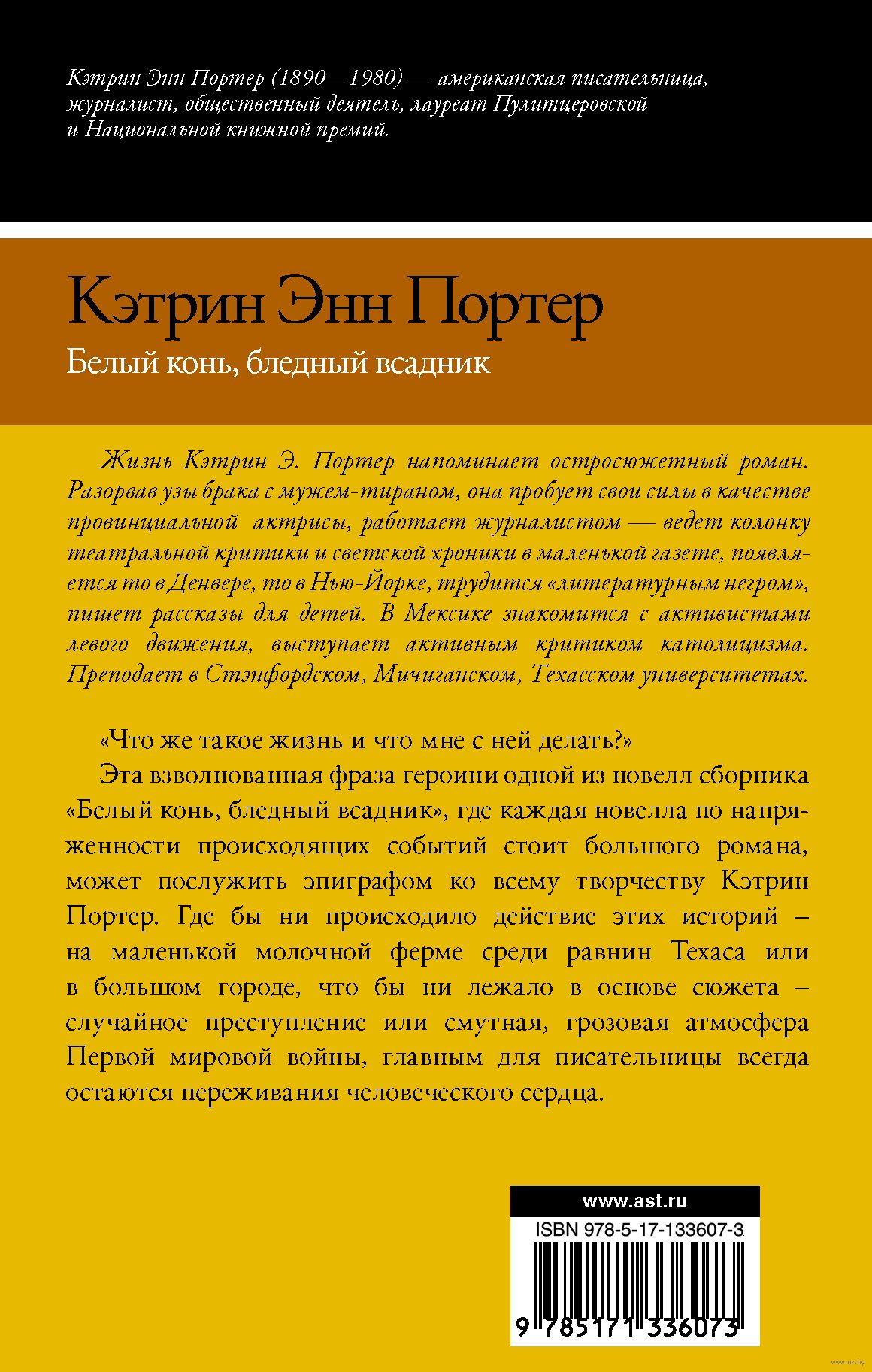 Эта взволнованная фраза героини одной из новелл сборника "Белый конь, бледный всадник", где каждая новелла по напряженности происходящих событий стоит большого романа, может послужить эпиграфом ко всему творчеству Кэтрин Портер. Где бы ни происходило действие этих историй – на маленькой молочной ферме среди равнин Техаса, или в большом городе, что бы ни лежало в основе сюжета – случайное преступление или смутная, грозовая атмосфера Первой мировой войны, главным для писательницы всегда остаются переживания человеческого сердца.