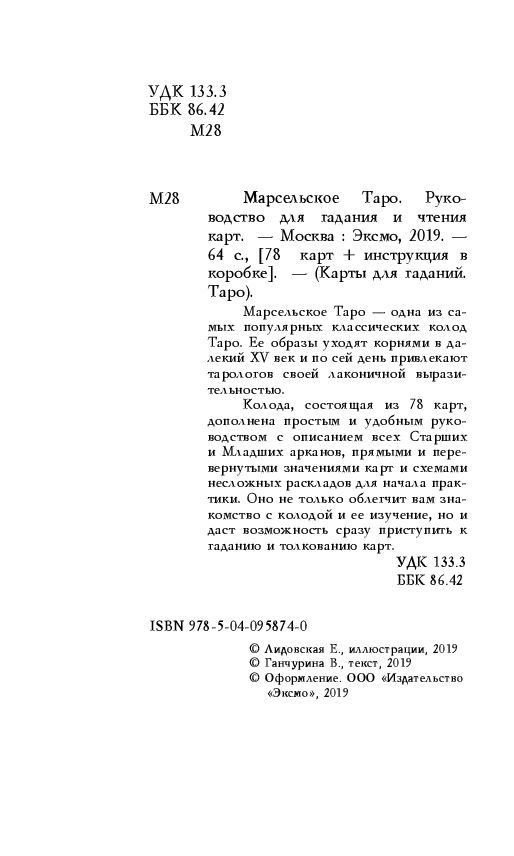 Марсельское Таро – одна из самых популярных классических колод таро. Ее образы уходят корнями в далекий XV век и по сей день привлекают тарологов своей лаконичной выразительностью. Колода, состоящая из 78 карт, дополнена простым и удобным руководством с описанием всех Старших и Младших арканов, прямыми и перевернутыми значениями карт и схемами несложных раскладов для начала практики. Оно не только облегчит вам знакомство с колодой и ее изучение, но и даст возможность сразу приступить к гаданию и толкованию карт.