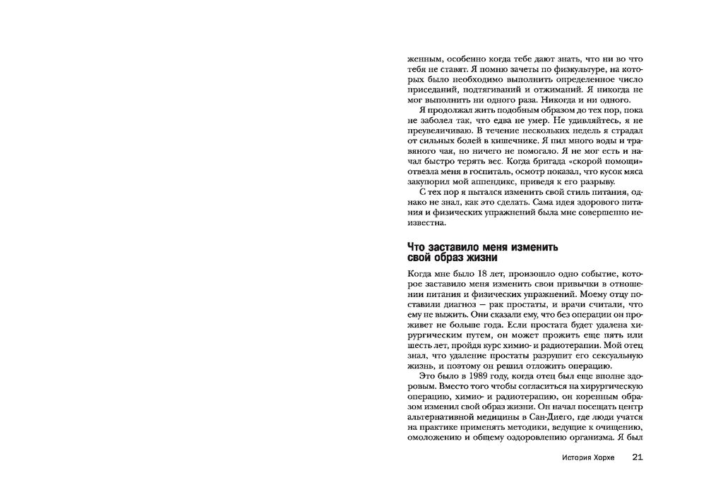 Здесь день за днём описывается 4-недельная программа оздоровления, которая не только кардинально улучшит ваше самочувствие, но и поможет избавиться от лишнего веса. Уже более 3 миллионов людей оценили все достоинства системы Хорхе и благодаря ей смогли: открыть в себе удивительный источник бодрости и энергии; распрощаться со многими заболеваниями; снизить давление и уровень холестерина в крови; уменьшить риск возникновения болезней сердца, инсульта, диабета, рака, остеопороза и артрита; ускорить свой обмен веществ; нормализовать сон; сбросить вес; перейти к здоровому и активному образу жизни.