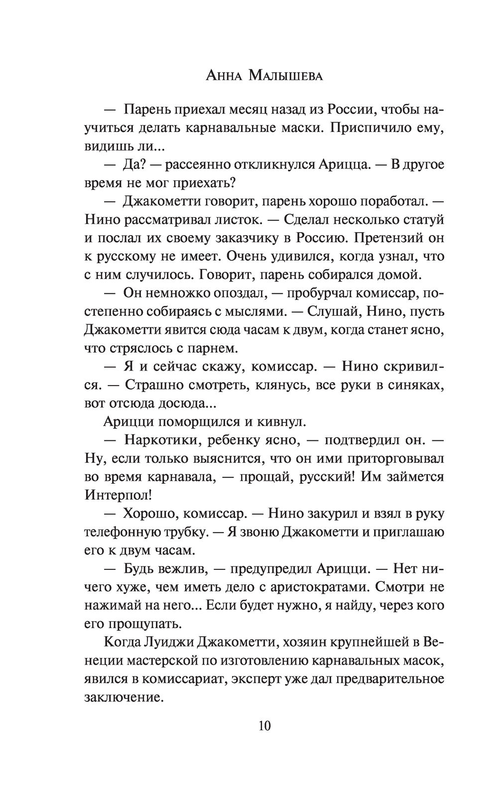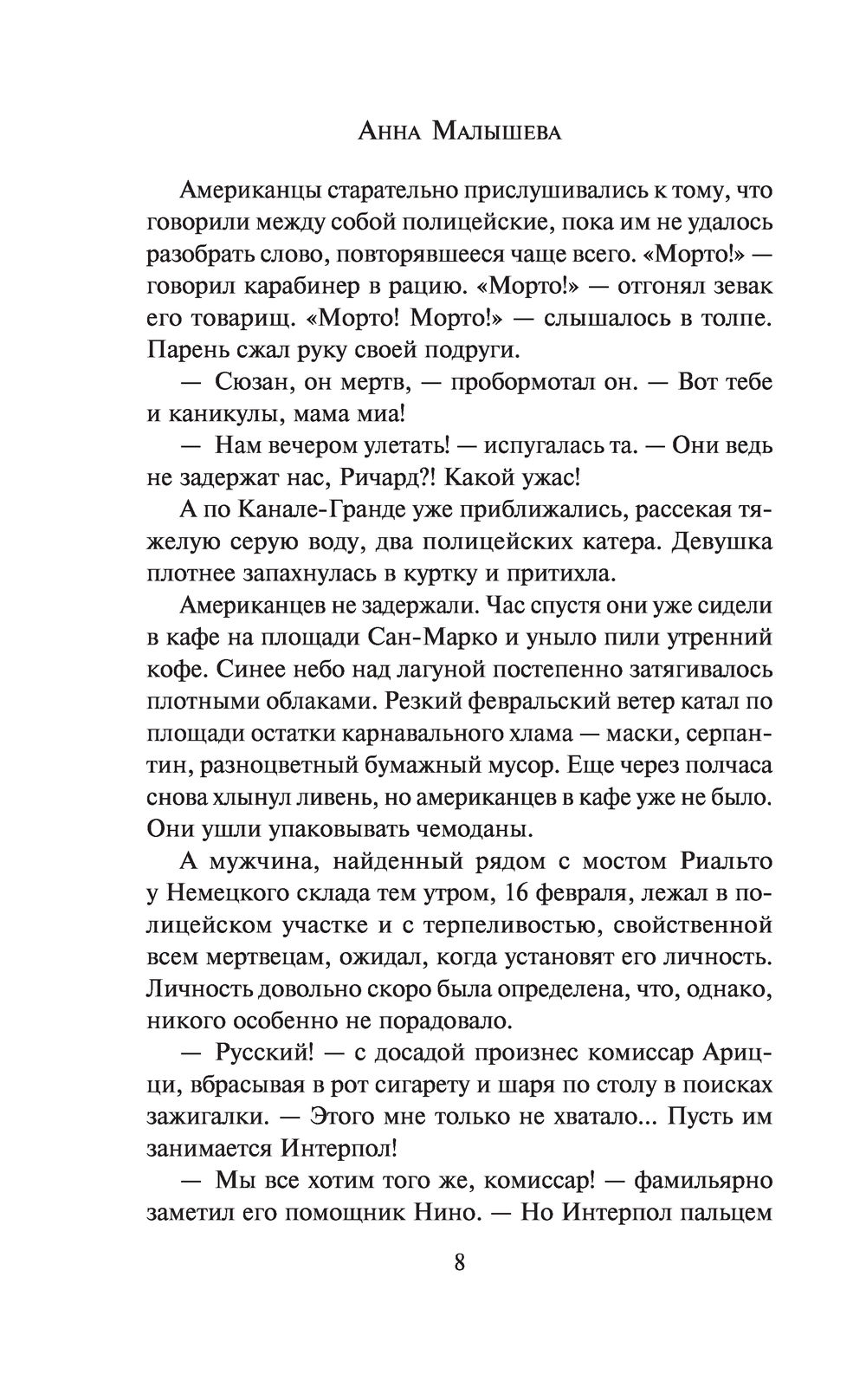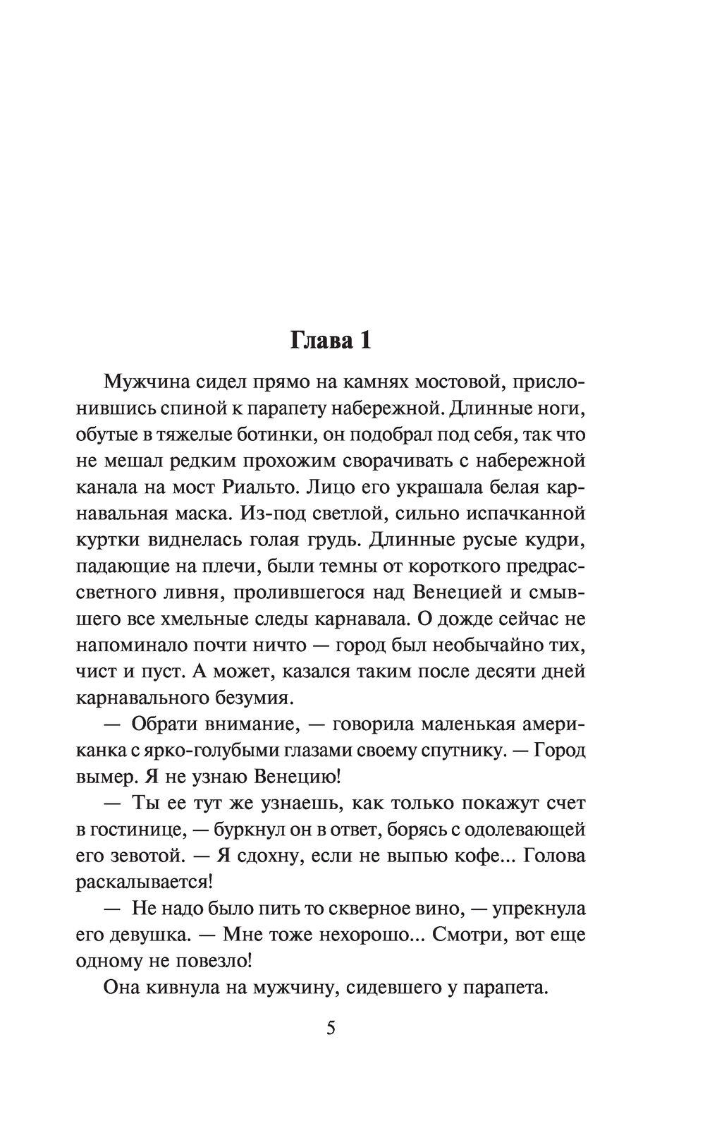 Ей дорого пришлось заплатить за право любить. Сперва – утратить иллюзии, затем – душевный покой, ну а дальше... Даша, медсестра наркологического центра, пытается выяснить, отчего погиб в Венеции, во время карнавала, ее возлюбленный – талантливый скульптор. Она ведет собственное расследование и заходит слишком далеко... На ее пути появляются люди, с которыми трудно спорить.