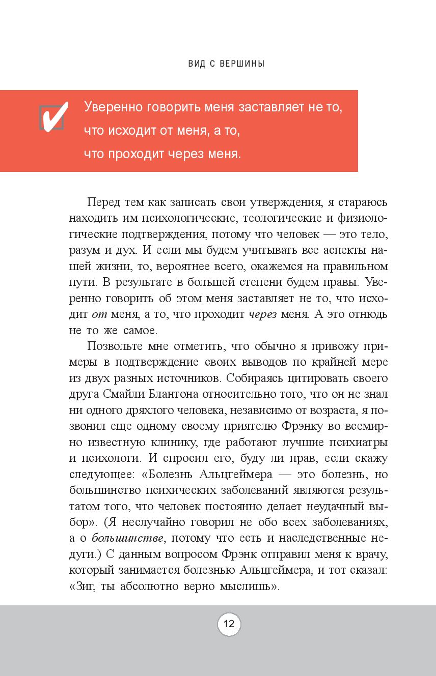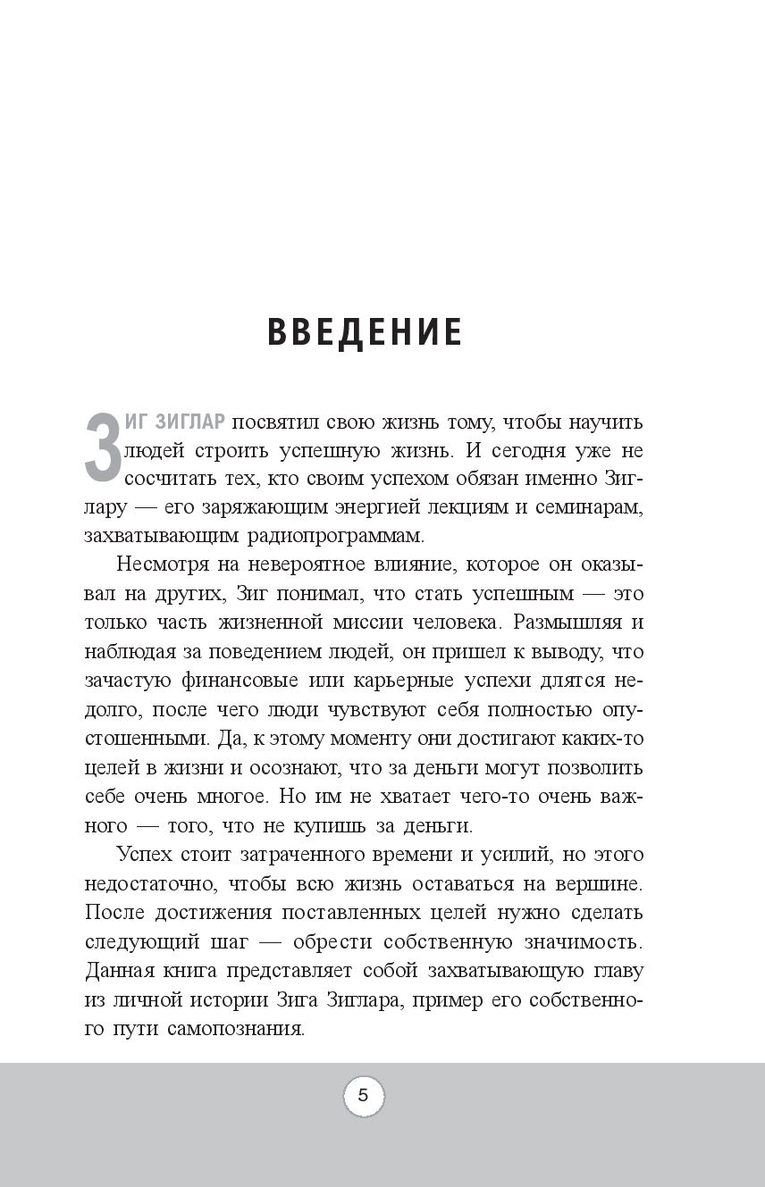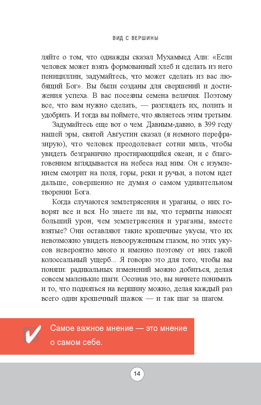 Независимо от того, знакомитесь вы с идеями Зига впервые или уже являетесь последователем его философии на протяжении многих лет, эта книга станет для вас откровением, которое изменит вашу жизнь. Она поможет вам добиться и успеха, и значимости. И когда это произойдёт, вы подниметесь на свою вершину и увидите собственными глазами, что вид оттуда просто великолепный.
