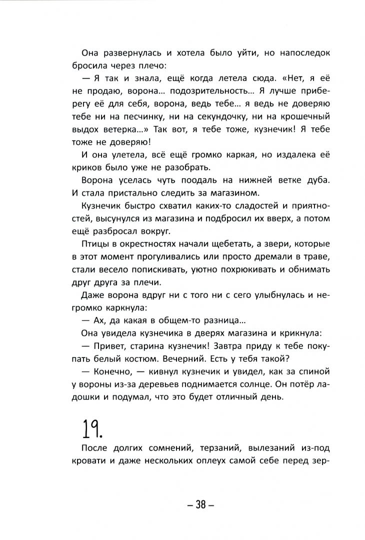 Кто сказал вам, что счастье не купишь в магазине? Значит, он просто никогда не был в магазине кузнечика! Здесь можно купить всё, абсолютно всё, чего бы вам ни захотелось. Сюда можно прийти в любое время за самым вкусным тортом; зелёной шапкой; раздвижной лестницей; тысячей разноцветных туфель (если вы тысяченожка); за смелостью и бесстыдством; за новым креслом и шкафом с зеркальными дверцами, двенадцатью полками, четырьмя выдвижными ящиками, медными шарнирами и встроенной лесенкой, чтобы доставать до самой верхней полки. Кузнечик продаст вам небольшое наводнение и торжественную речь для выступлений, и даже ещё один новый день, если ваши собственные вдруг закончились.