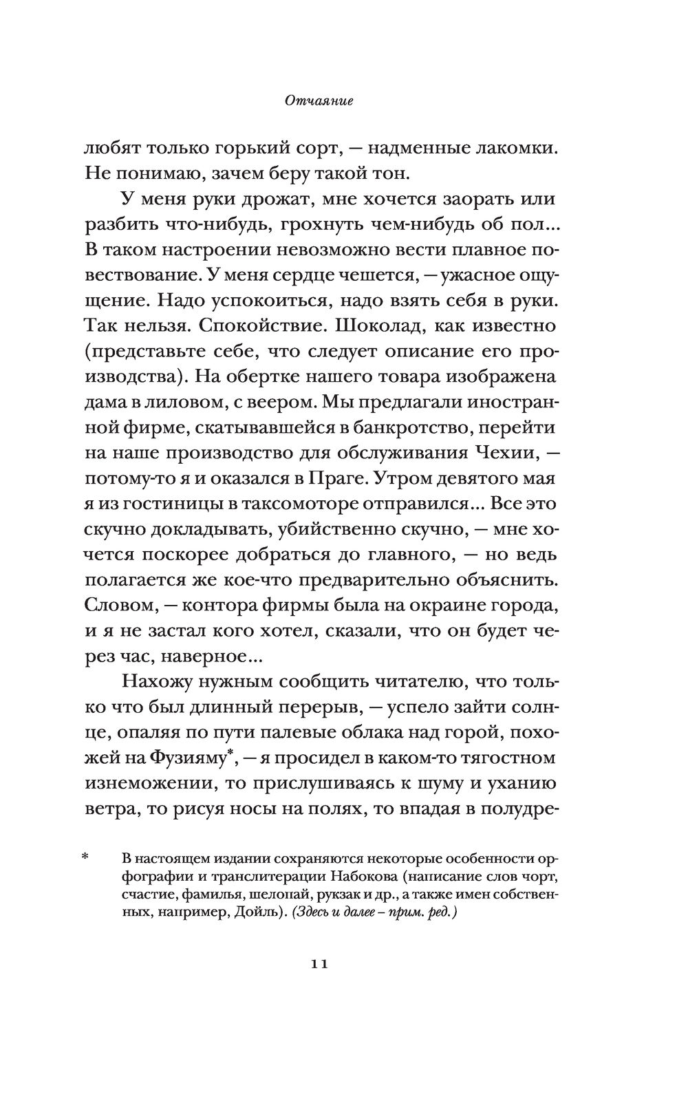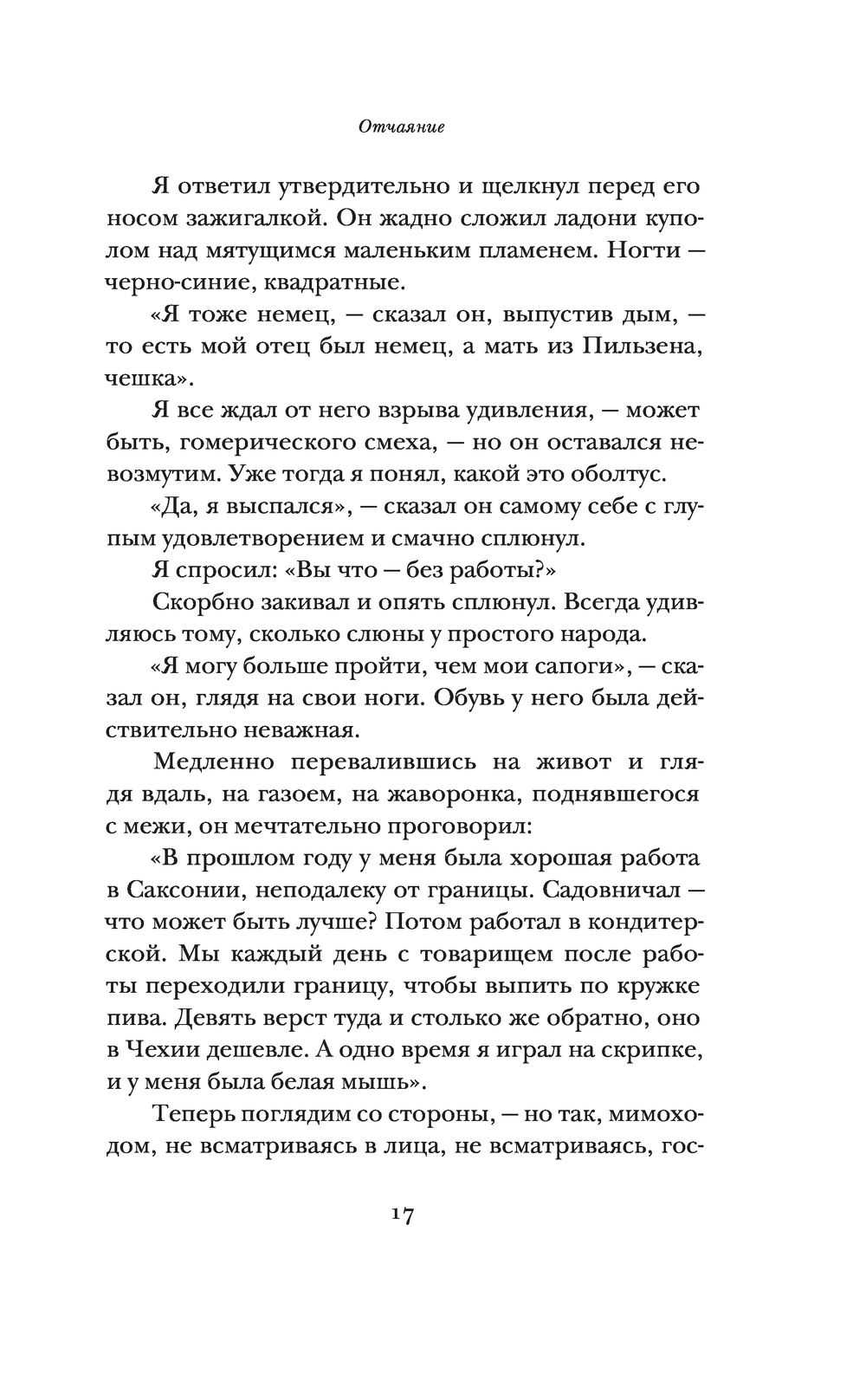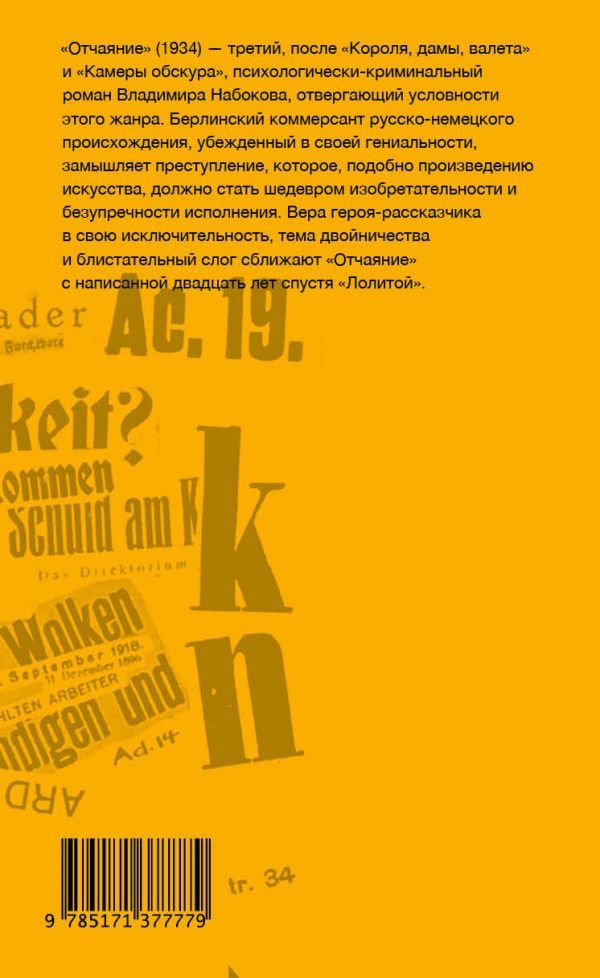 "Отчаяние" (1934) – шестой роман Владимира Набокова, написанный в Берлине, и его третий, после "Короля, дамы, валета" и "Камеры обскура", психологически-криминальный роман, отвергающий условности этого жанра. Герман, берлинский коммерсант русско-немецкого происхождения, убежденный в своей гениальности, замышляет преступление, которое, подобно произведению искусства, должно стать шедевром изобретательности и безупречности исполнения. Жизнь, однако, оказывается намного остроумнее и художественней порочного замысла, кривое зеркало которого лишь искажает реальность.