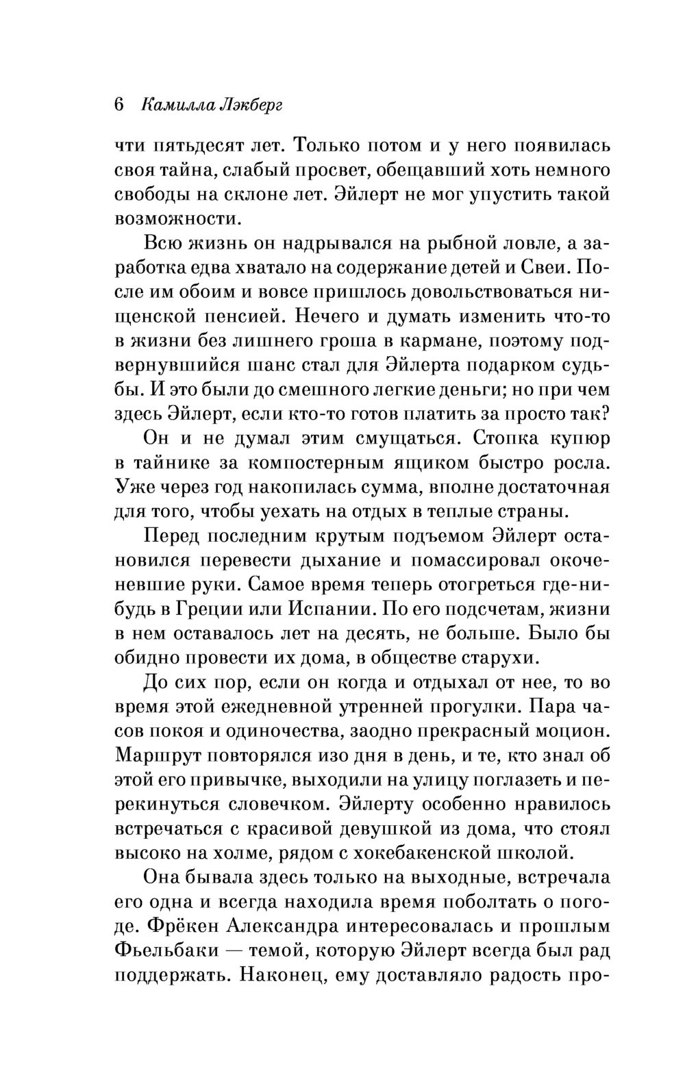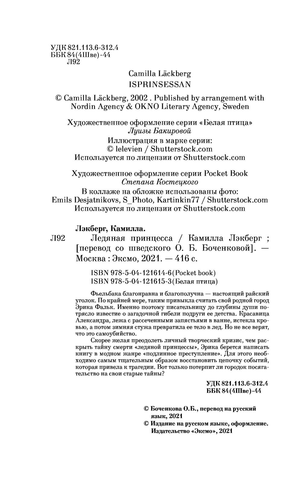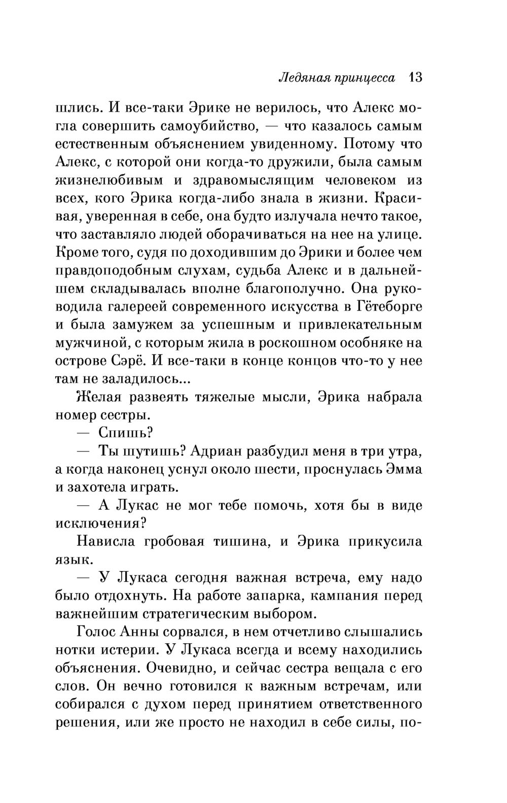 Фьельбака благонравна и благополучна – настоящий райский уголок. По крайней мере, таким привыкла считать свой родной город Эрика Фальк. Именно поэтому писательницу до глубины души потрясло известие о загадочной гибели подруги ее детства. Красавица Александра, лежа с рассеченными запястьями в ванне, истекла кровью, а потом зимняя стужа превратила ее тело в лед. Но не все верят, что это самоубийство. Скорее желая преодолеть личный творческий кризис, чем раскрыть тайну смерти "ледяной принцессы", Эрика берется написать книгу в модном жанре "подлинное преступление". Для этого необходимо самым тщательным образом восстановить цепочку событий, которая привела к трагедии. Вот только потерпит ли городок посягательство на свои старые тайны?