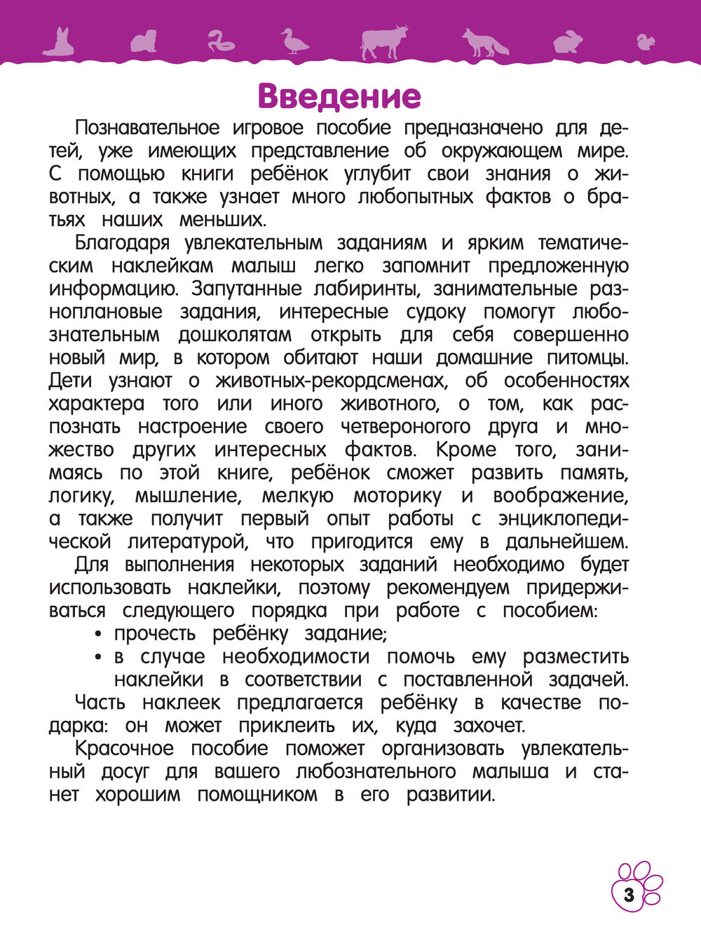 Благодаря увлекательным игровым заданиям и ярким тематическим наклейкам ребёнок без труда запомнит предложенную информацию. Запутанные лабиринты, занимательные разноплановые задания, интересные судоку помогут любознательным дошколятам открыть для себя совершенно новый мир, в котором обитают наши домашние питомцы. Они узнают о животных-рекордсменах, об особенностях характера братьев наших меньших, о том, как распознать настроение своего четвероногого друга и множество других любопытных фактов. Кроме того, занимаясь по этой книге, ребёнок получит первый опыт работы с энциклопедической литературой, что пригодится ему в дальнейшем.