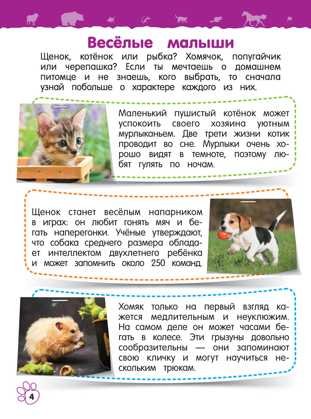 Весёлые щенки, милые котята, резвые хомяки, шумные цыплята, грациозные жеребята и даже экзотические слоны и обезьяны на протяжении тысячелетий живут рядом с человеком. На страницах нашей увлекательной красочной книги малышей ждёт множество любопытных фактов об этих и других домашних животных.