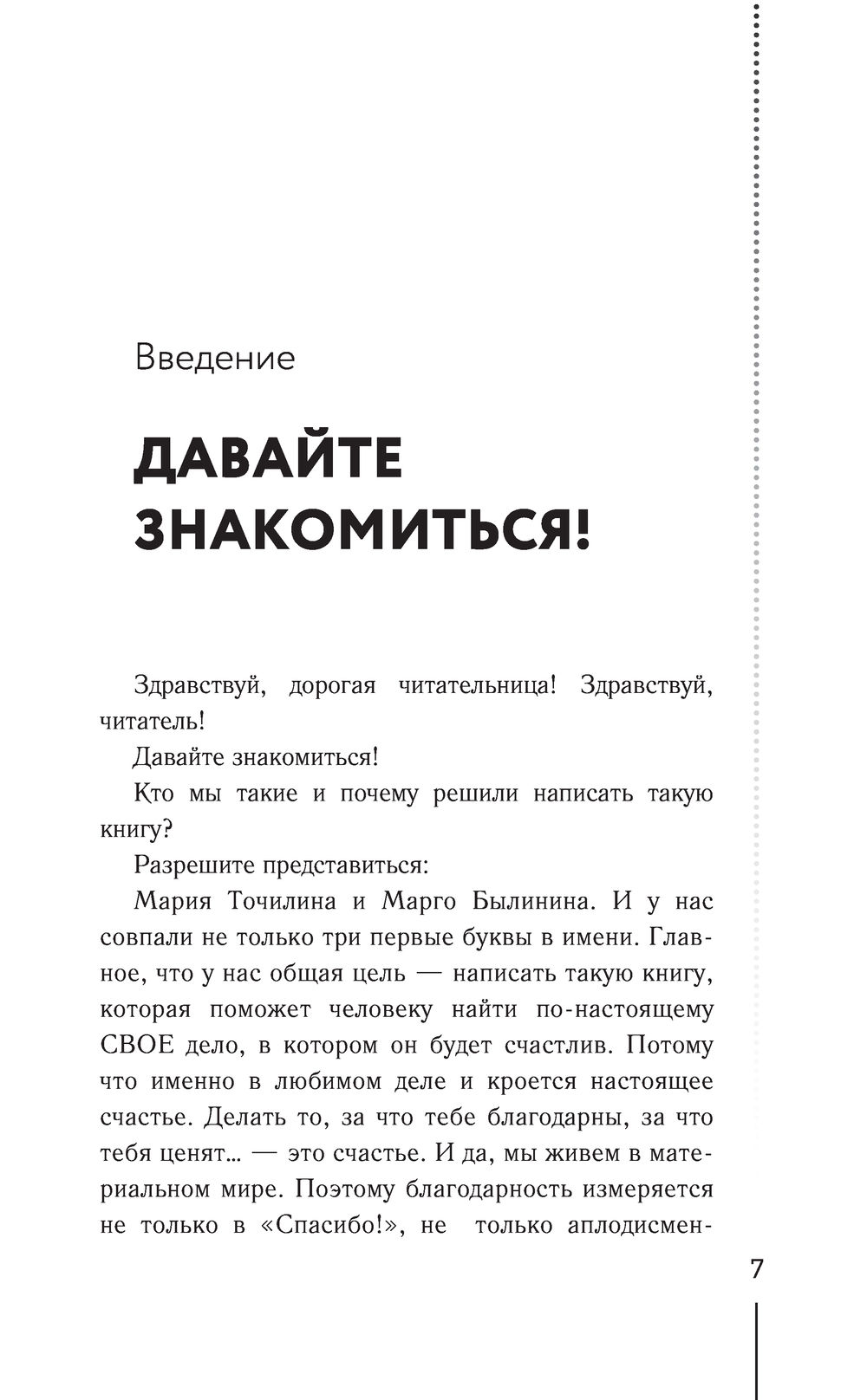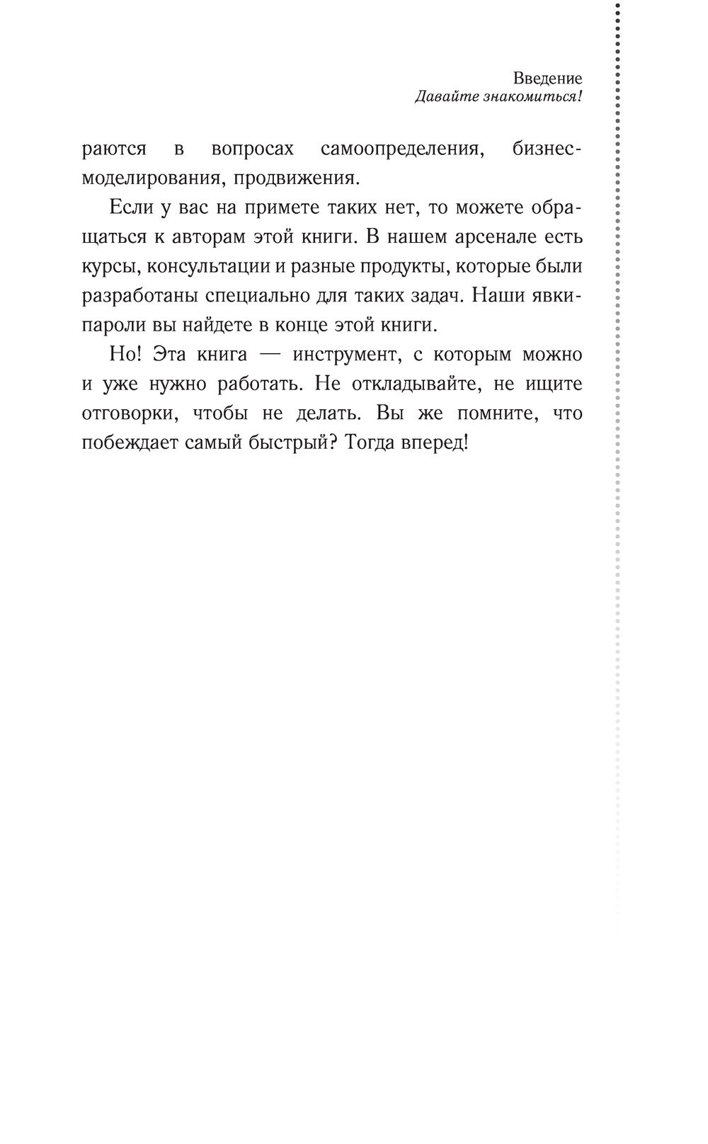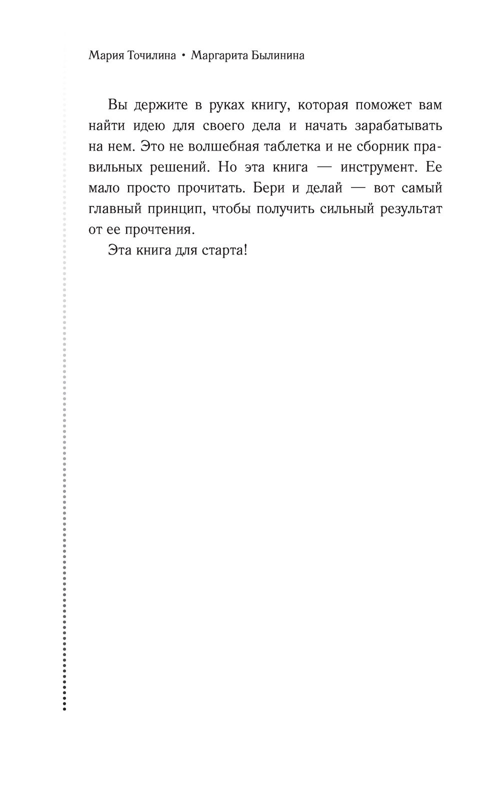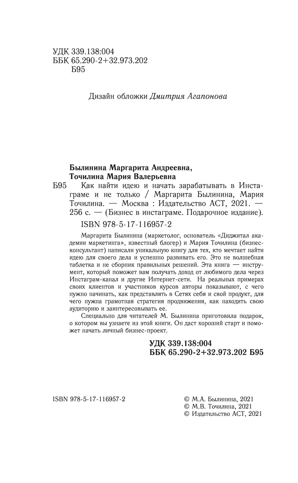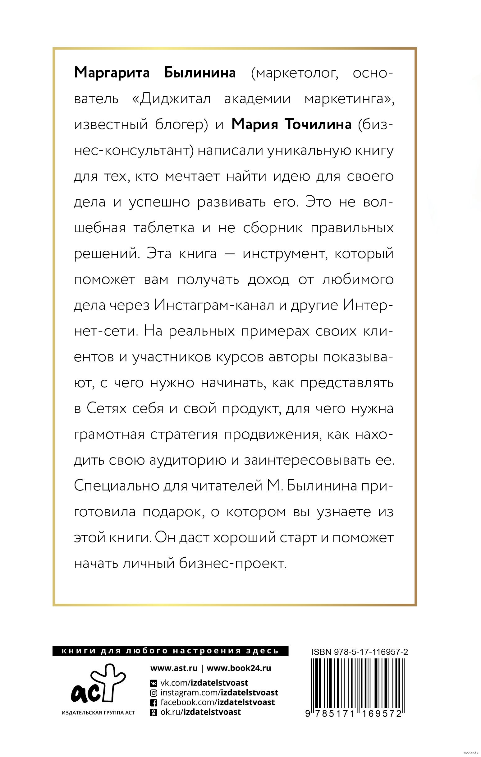 Маргарита Былинина (маркетолог, известный блогер) и Мария Точилина (бизнес‑консультант) написали уникальную книгу для тех, кто мечтает найти идею для своего дела и успешно развивать его. Это не волшебная таблетка и не сборник правильных решений. Эта книга - инструмент, который поможет вам получать доход от любимого дела через Инстаграм‑канал и другие Интернет‑сети. На реальных примерах своих клиентов и участников курсов авторы показывают, с чего нужно начинать, как представлять в Сетях себя и свой продукт, для чего нужна грамотная стратегия продвижения, как находить свою аудиторию и заинтересовывать ее. Специально для читателей М. Былинина приготовила подарок, о котором вы узнаете из этой книги. Он даст хороший старт и поможет начать личный бизнес‑проект.