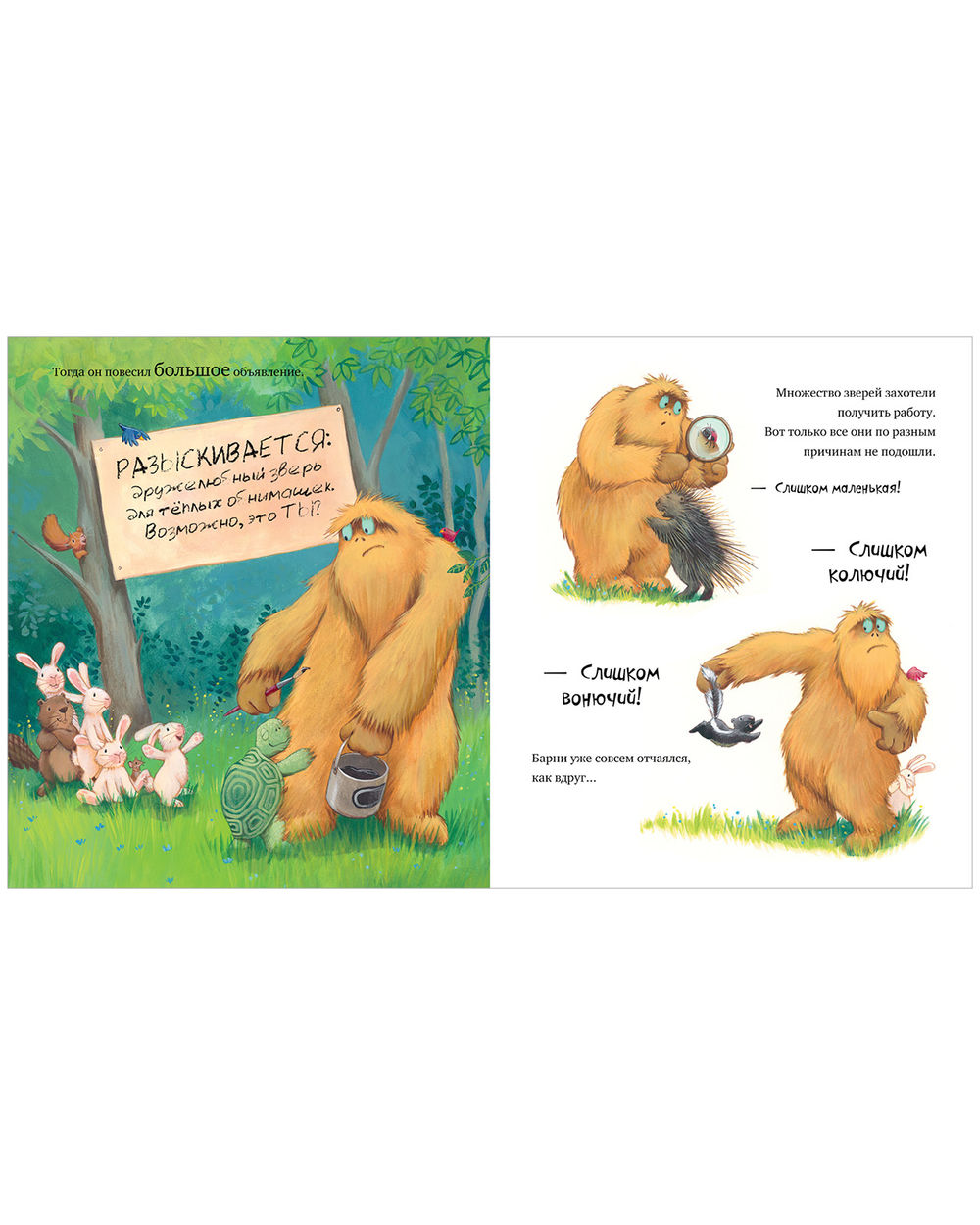На этот раз мы познакомимся с мохнатым чудищем по имени Барни. Не переживайте, он совсем не страшный, а как раз наоборот – невероятно милый, обаятельный и даже обнимательный! Все звери леса так и норовят заключить его в свои объятия. Конечно, Барни это тоже любит, но... довольно неудобно, когда тебя обнимают, гладят, чешут и щекочут целый день напролет. Что придумает Барни?