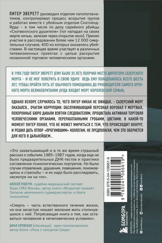 Что мы знаем о работе патологоанатома и внутренней жизни такого мрачного места, как морг? Эта книга написана человеком, которому довелось пройти путь от рядового служащего до директора главного морга в Великобритании, провести несколько тысяч вскрытий, поучаствовать в расследовании нашумевшего дела "Скотвеллского душителя" и очутиться в пучине настоящего коррупционного скандала.