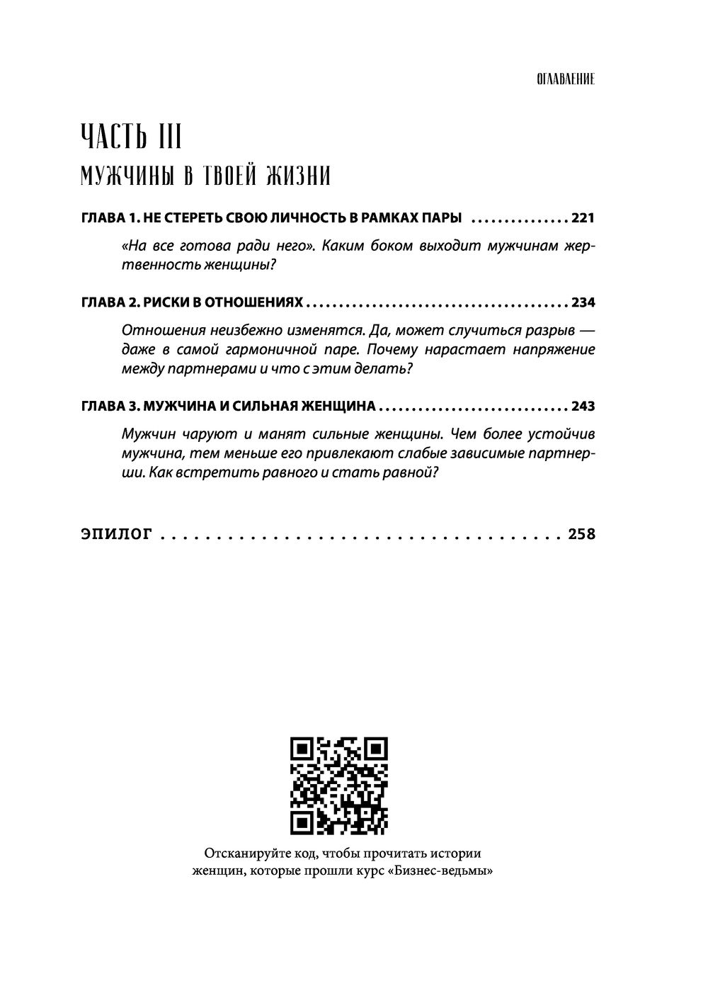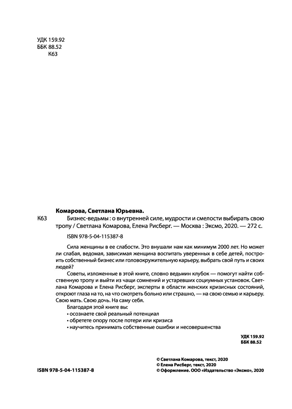 Советы, изложенные в этой книге, словно ведьмин клубок – помогут найти собственную тропу и выйти из чащи сомнений и устаревших социумных установок. Светлана Комарова и Елена Рисберг, эксперты в области женских кризисных состояний, откроют глаза на то, на что смотреть больно или страшно, – на свою семью и карьеру. Свою мать. Свою дочь. На саму себя.