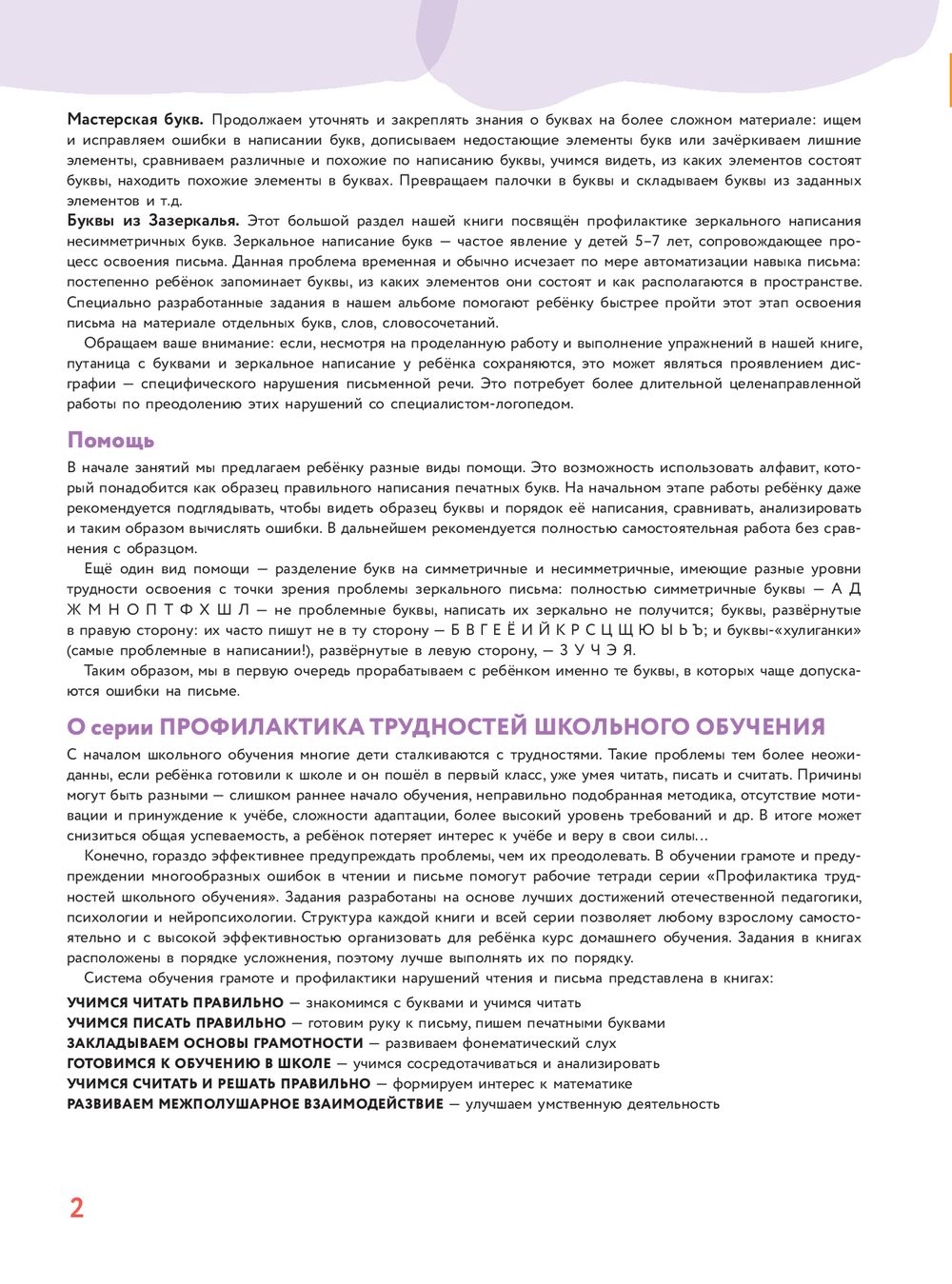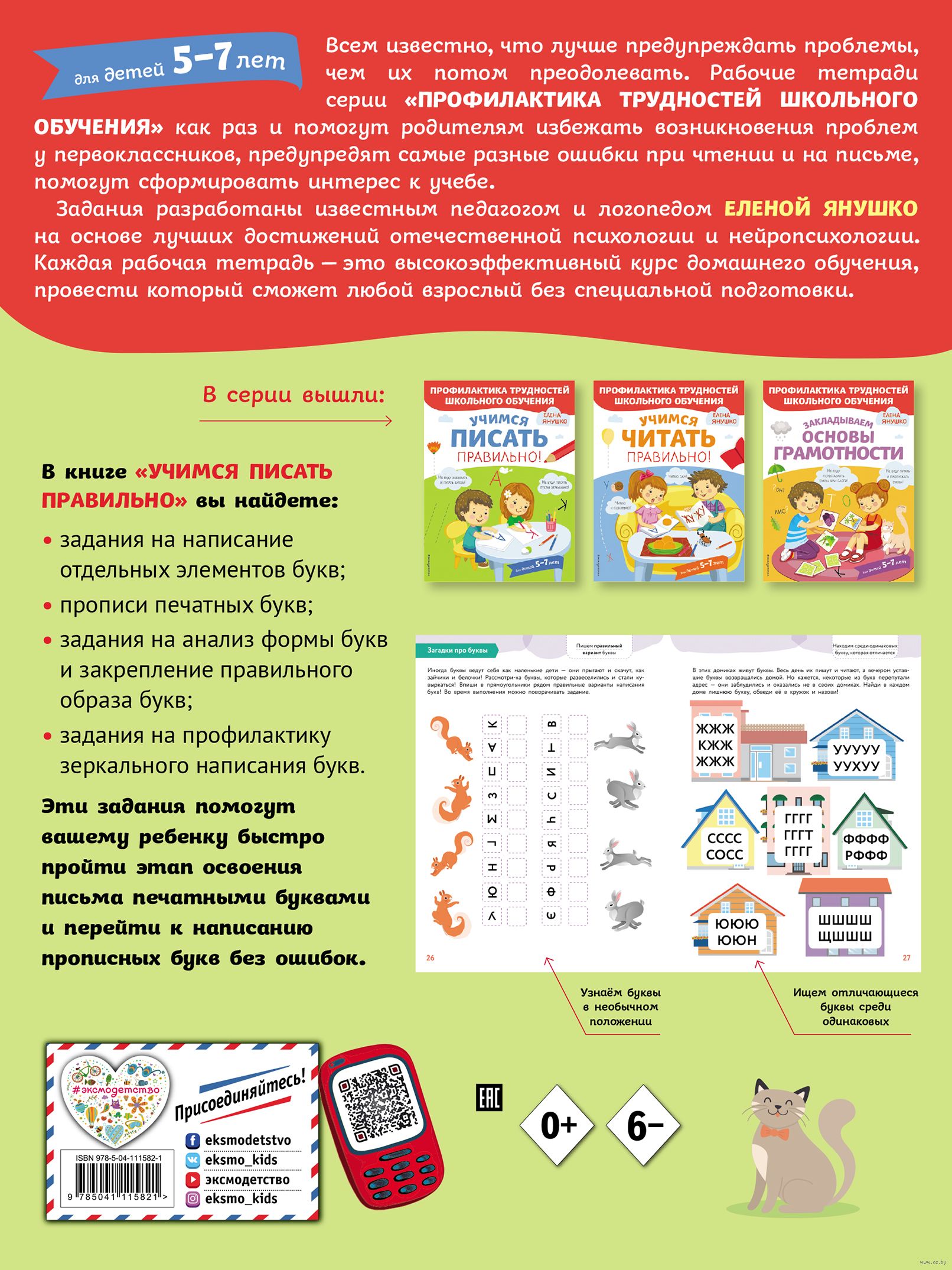 У вас в руках уникальное пособие, которое включает специально разработанные задания, позволяющие при обучении грамоте вовремя выявлять ошибки и исправлять их. Ваш ребёнок выучит буквы, потренируется в письме печатными буквами и запомнит, как буквы располагаются в пространстве, что поможет в дальнейшем избежать зеркального написания букв. Все задания интерактивны и даны с постепенным усложнением. В помощь родителям: подробная инструкция и подсказки с ответами.