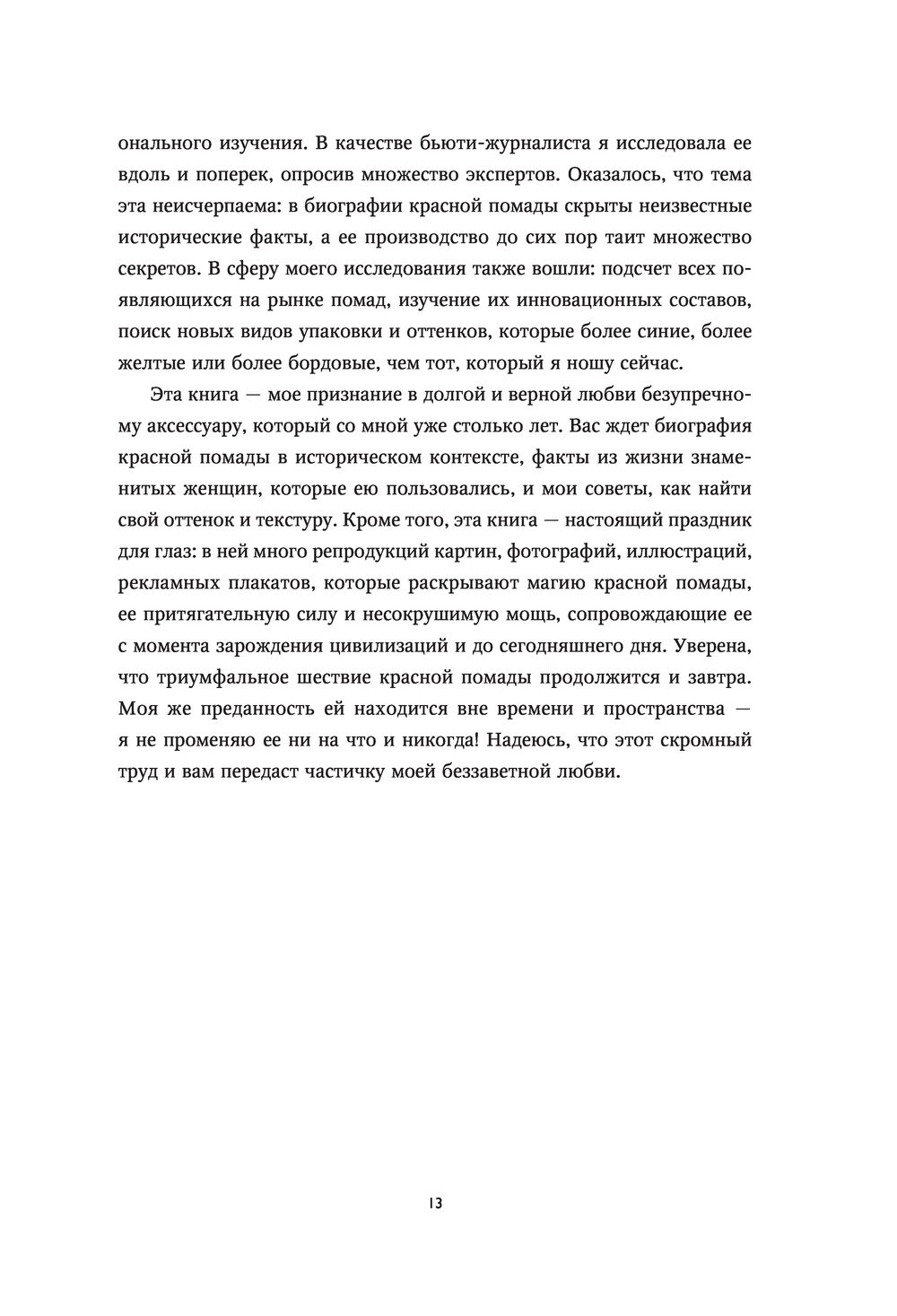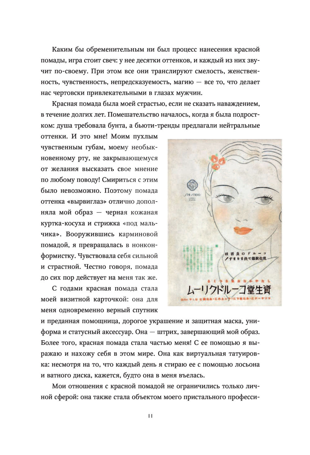 Книга – настоящий праздник для глаз: в ней много репродукций картин, уникальных фотографий, стильных иллюстраций и редких рекламных плакатов, которые раскрывают магию красной помады, притягательную силу и несокрушимую мощь, сопровождающие ее с момента зарождения цивилизаций и до сегодняшнего дня. Теперь каждая женщина сможет взглянуть на красную помаду другими глазами.