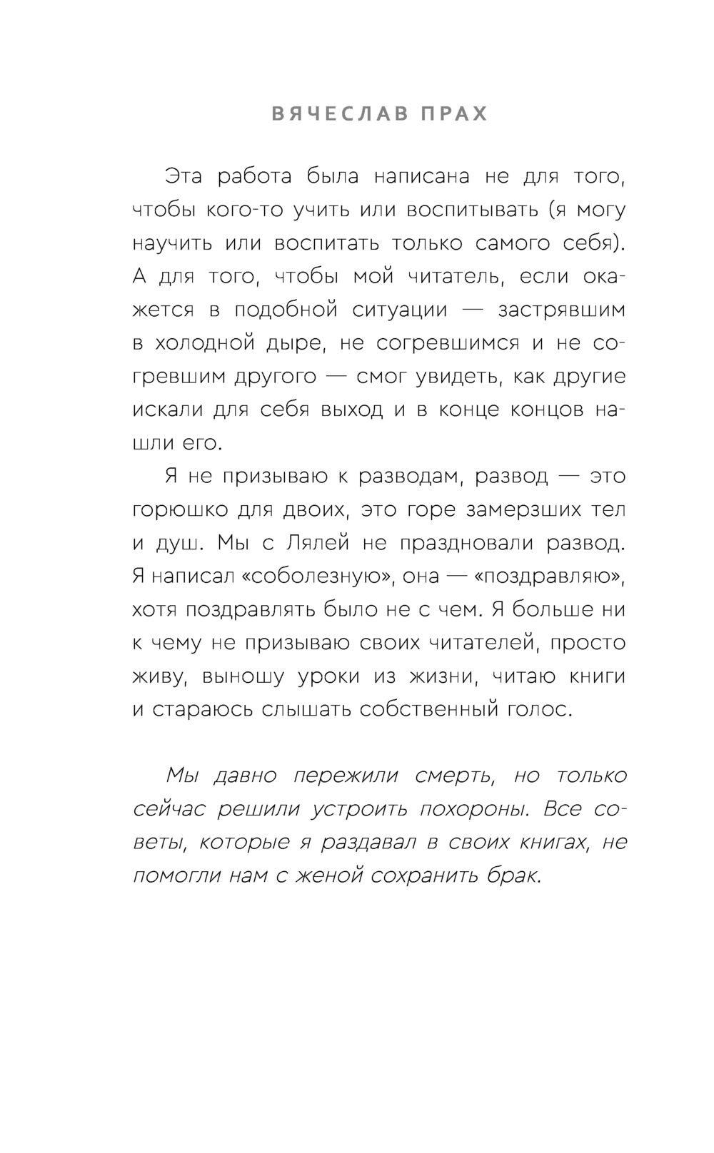 "Я разведен, но я до сих пор верю в любовь..." – с этих строк начинается книга-откровение Вячеслава Праха о том, о чем зачастую не принято говорить вслух.