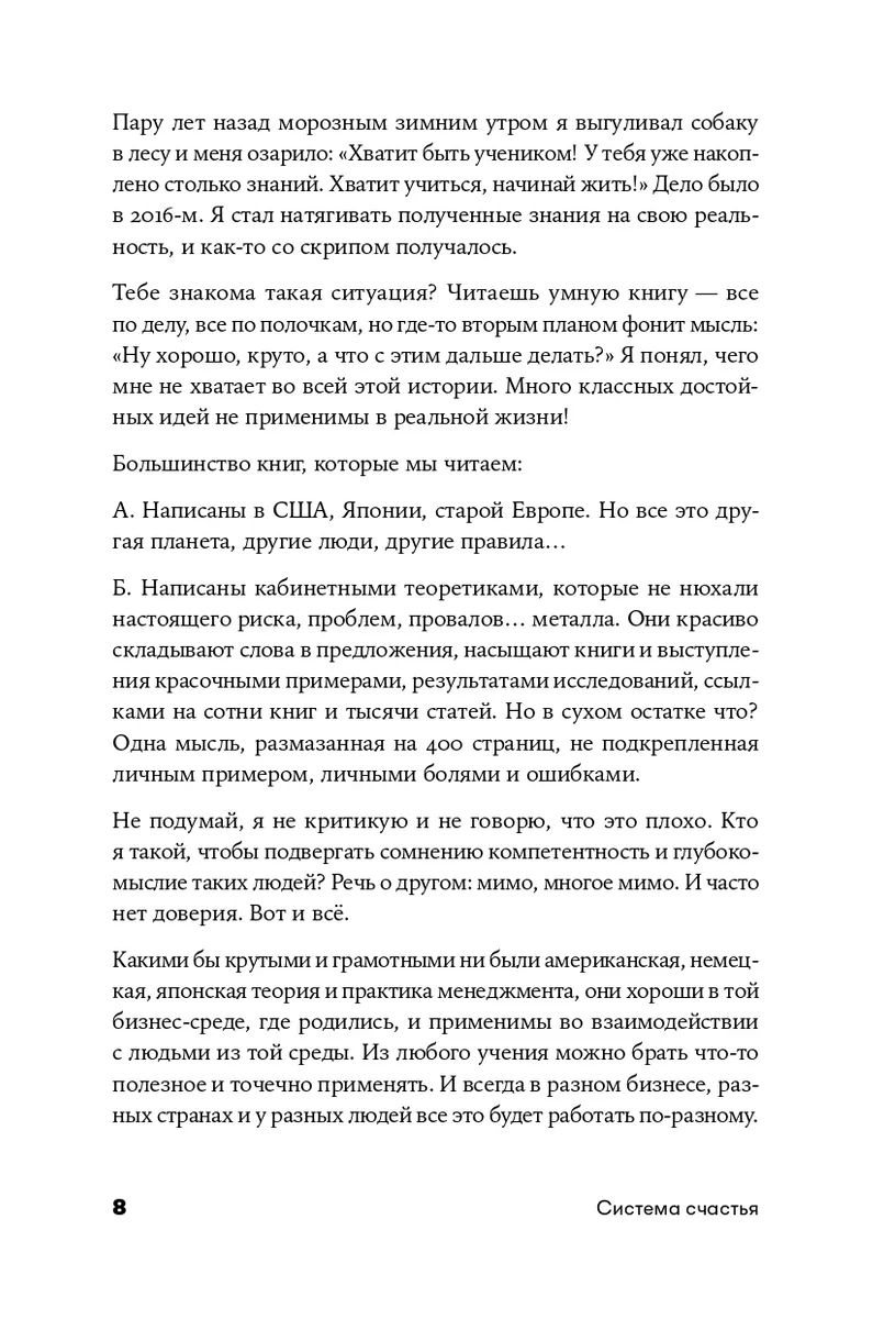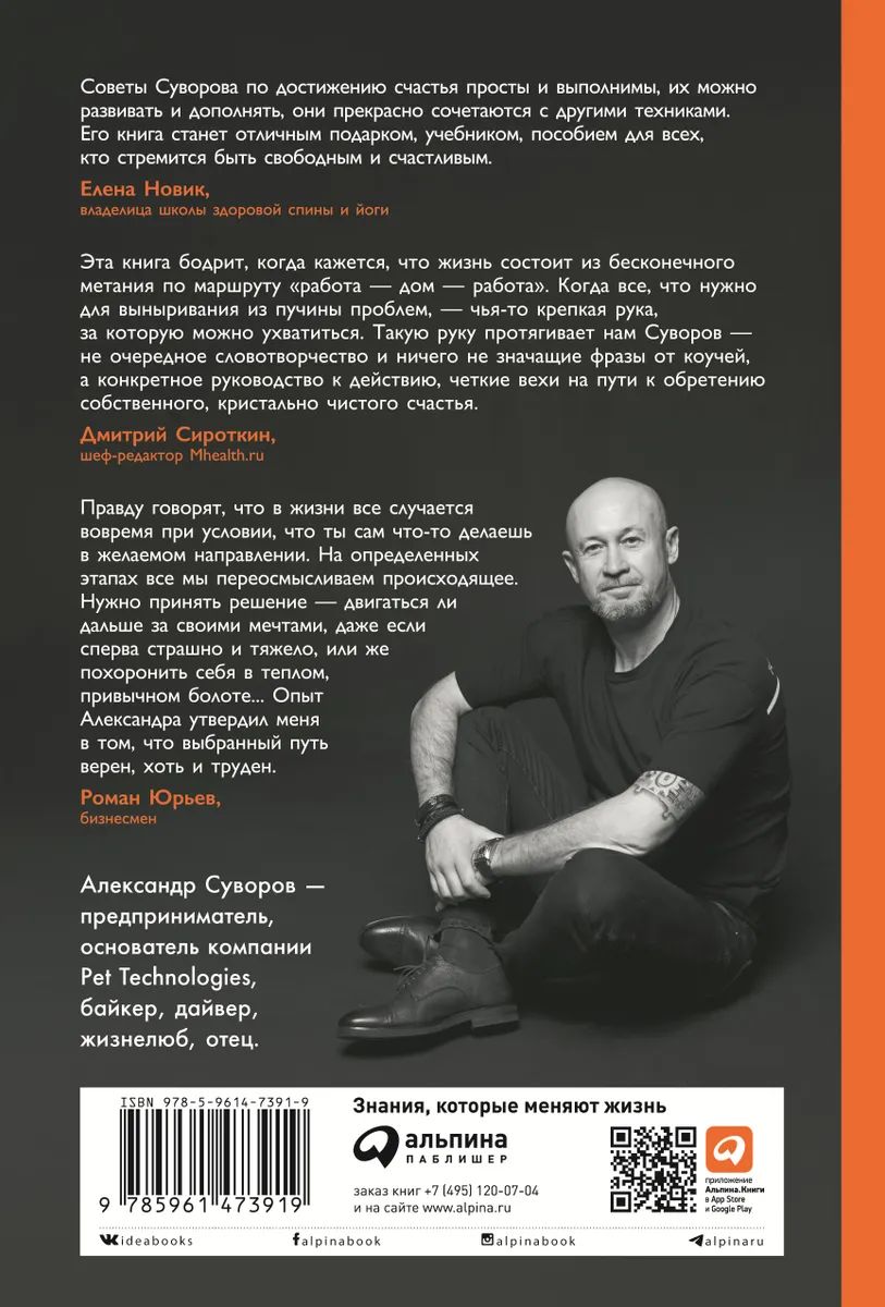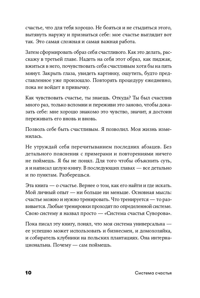 Автор книги Александр Суворов – бизнесмен, глава компании PET Technologies, "производственник". По его мнению, счастье можно и нужно тренировать. Что тренируется – то развивается. Любые тренировки проходят по определенной системе. Свою систему он назвал просто – "Система счастья Суворова". Система универсальна – ее успешно может использовать и бизнесмен, и домохозяйка, и собиратель клубники на польских плантациях. Она интернациональна.