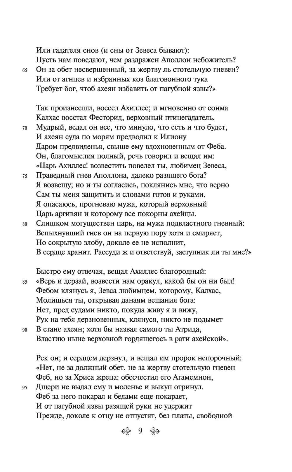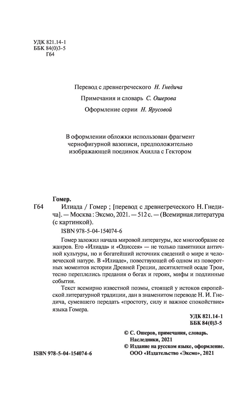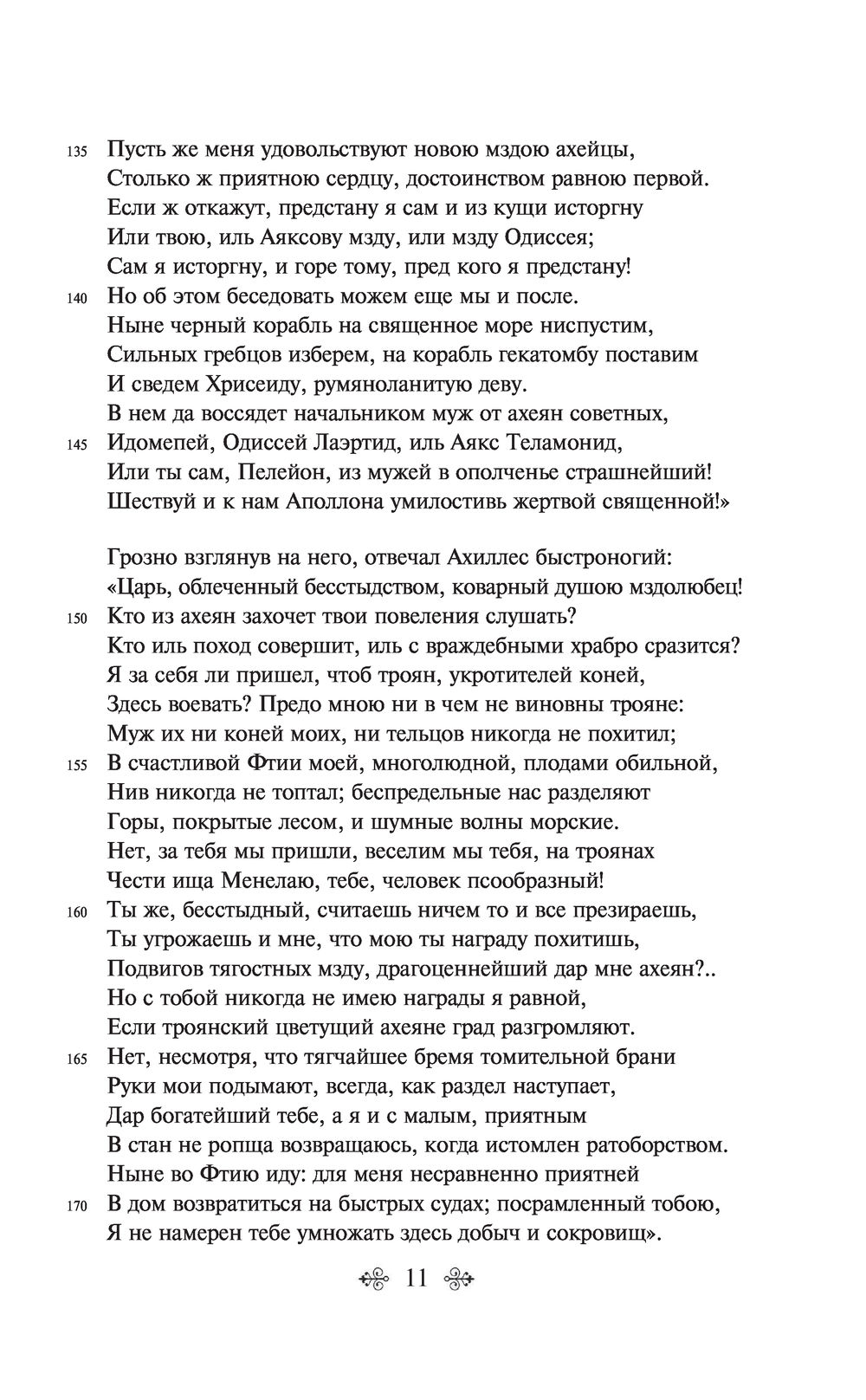 Гомер заложил начала мировой литературы, все многообразие ее жанров. Его "Илиада" и "Одиссея" – не только памятники античной культуры, но и богатейший источник сведений о мире и человеческой натуре. "Илиада" повествует об одном из поворотных моментов истории Древней Греции, десятилетней осаде Трои, войне, начатой во имя любви. Здесь тесно переплелись предания о богах и героях, мифы и подлинные события. Текст всемирно известной поэмы, стоящей у истоков европейской литературной традиции, дан в знаменитом переводе Н.И.Гнедича, сумевшего передать "простоту, силу и важное спокойствие" языка Гомера.