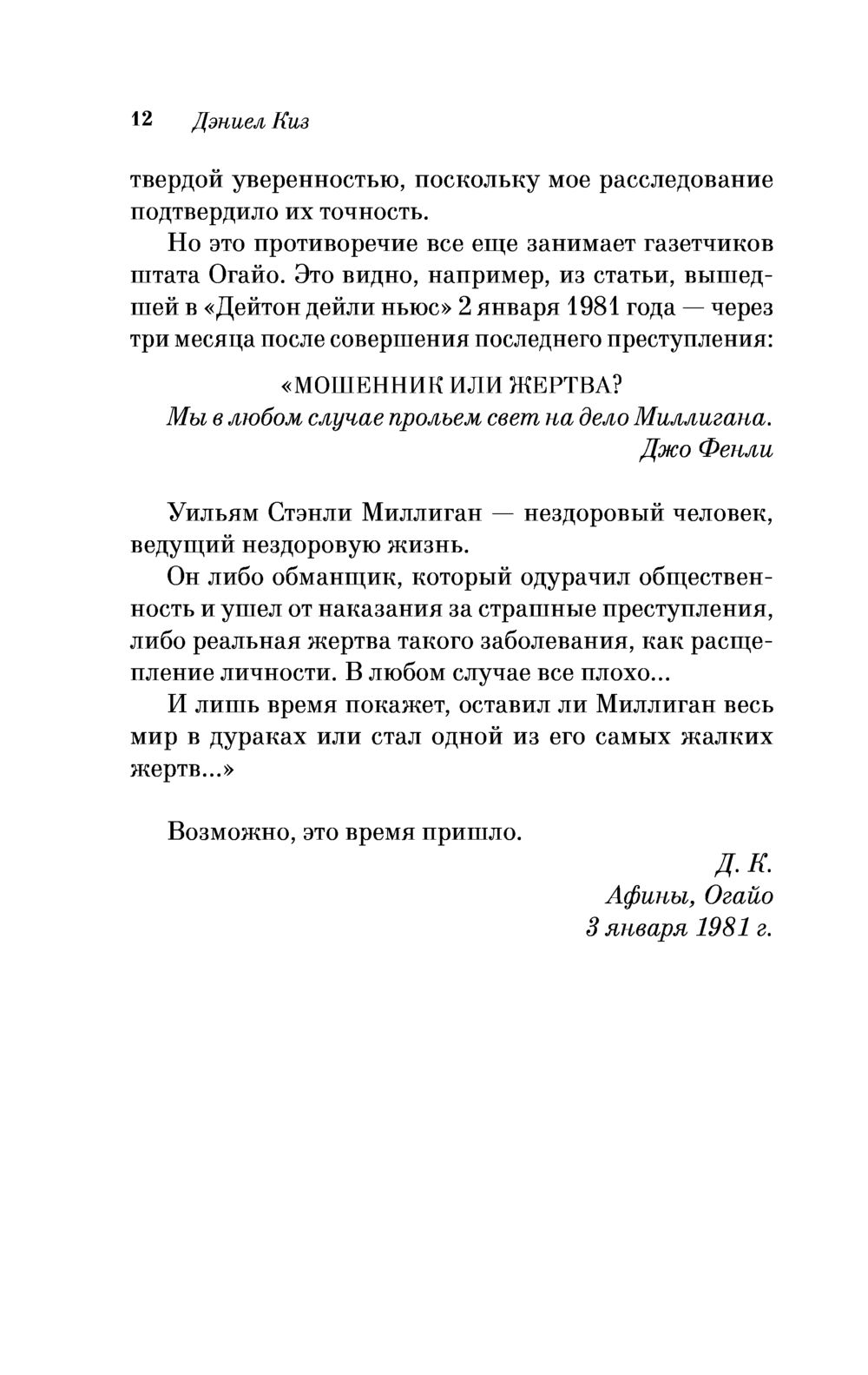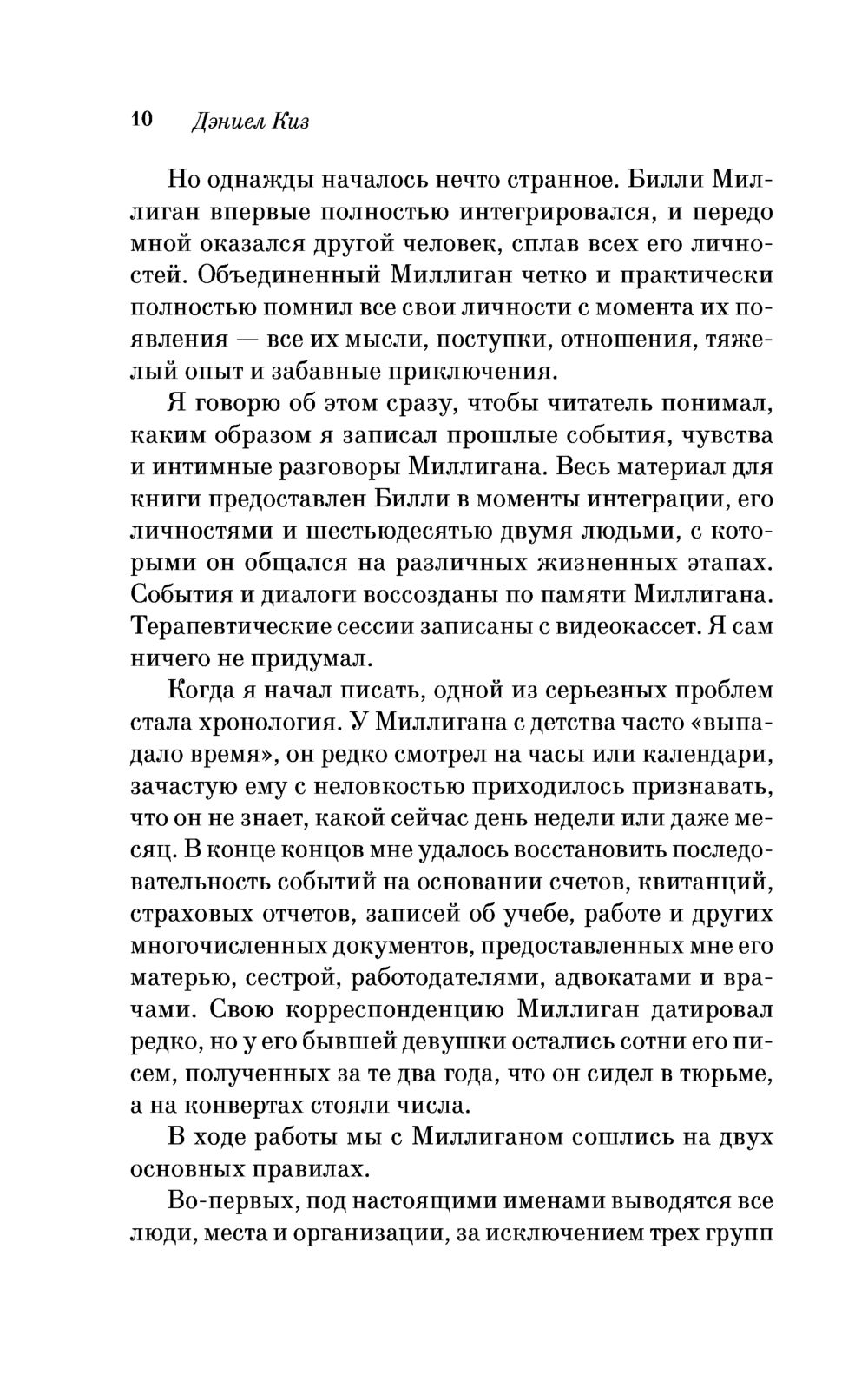 Билли просыпается и обнаруживает, что находится в тюремной камере. Ему сообщают, что он обвиняется в изнасиловании и ограблении. Билли потрясен: он ничего этого не делал! Последнее, что он помнит,- это как хотел броситься вниз с крыши здания школы. Ему говорят, что с тех пор прошло семь лет. Билли в ужасе: у него опять украли кусок жизни! Его спрашивают: что значит "украли кусок жизни"? И почему "опять"? Выходит, такое случается с ним не впервые? Но Билли не может ответить, потому что Билли ушел... Перу Дэниела Киза принадлежит одно из культовых произведений конца XX века – роман "Цветы для Элджернона". "Таинственная история Билли Миллигана" не менее потрясающа и проникновенна.