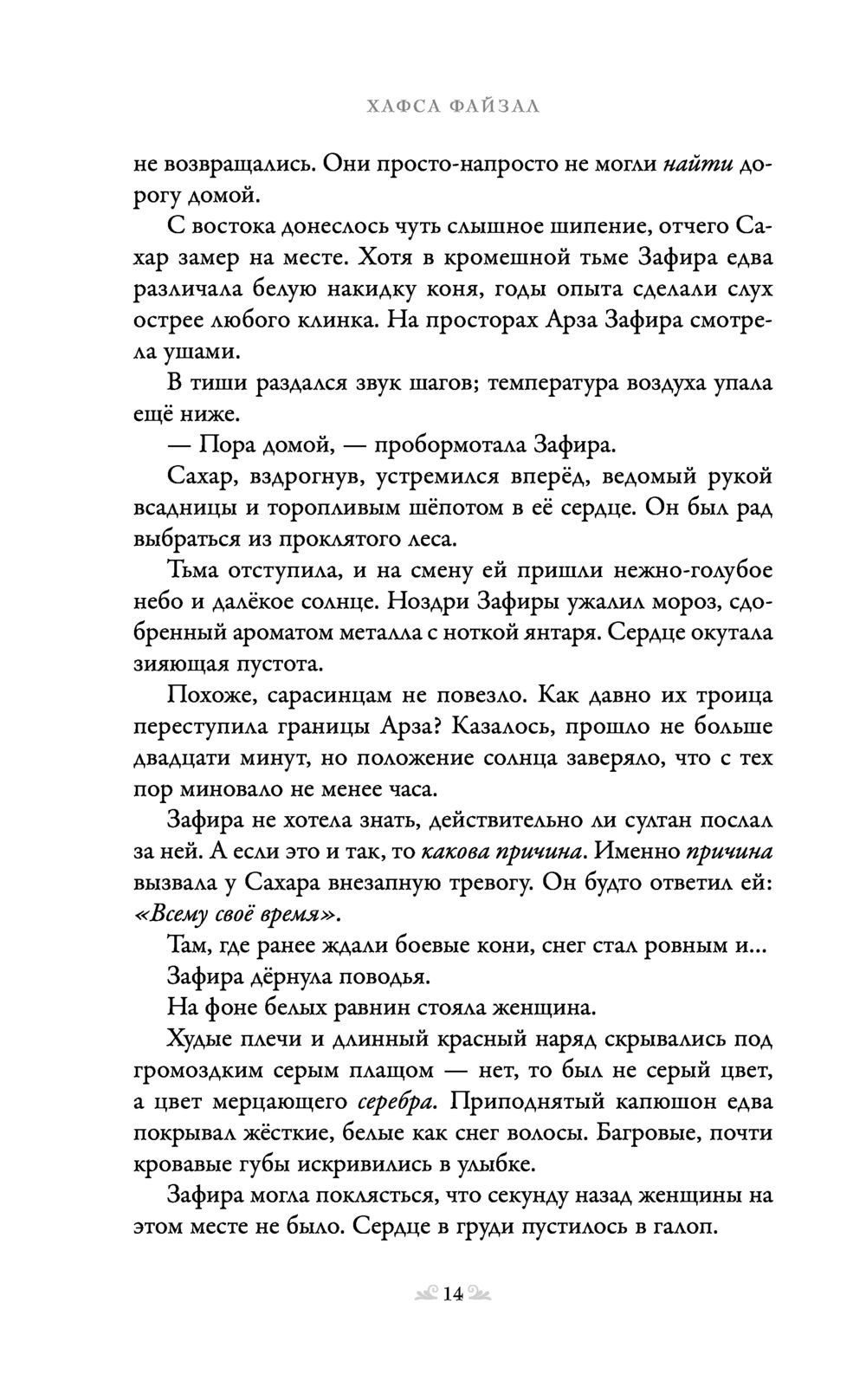 Зафира – Охотник. Она скрывает лицо под маской и раз за разом отправляется на охоту в проклятый лес Арз, пожирающий людей, чтобы её народ мог выжить. Насир – Принц Смерти. Он убивает тех, кто достаточно глуп, чтобы бросить вызов его жестокому отцу-султану. Они – легенды Аравии, но ни один из них не желал этой славы. Пока Арз медленно поглощает королевство, Зафира отправляется на поиски артефакта, который поможет остановить заколдованный лес и спасти Аравию. Она не знает, что Принц Смерти уже получил от отца новое задание: найти тот же артефакт – и убить Охотника. Но древнее зло встаёт на пути у них обоих – и врагам приходится объединиться, чтобы противостоять куда более грозному противнику... Встречайте первую часть фэнтезийной YA дилогии "Пески Аравии": завораживающую историю о сильных героях с чарующим флёром арабских ночей.