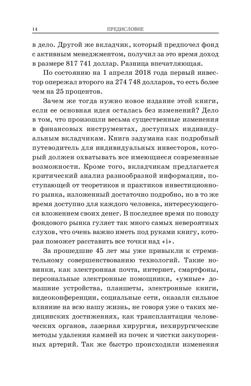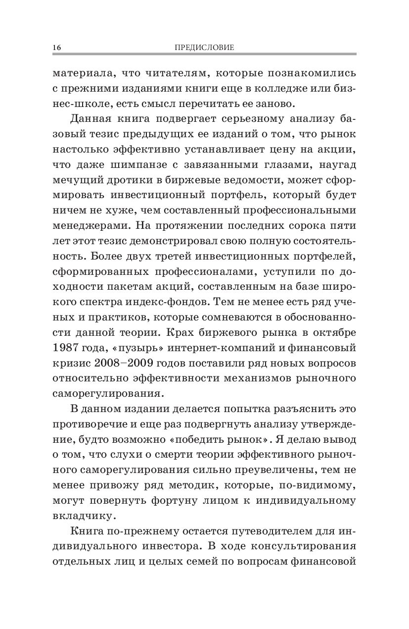 Во времена растущего неравенства, когда высокочастотный трейдинг и хедж-фонды, казалось бы, не оставляют надежд рядовому инвестору, классический труд Мэлкила необходим больше, чем когда-либо. В нём вы найдёте не хитроумные трюки, а проверенные временем и подкреплённые научными исследованиями стратегии по формированию инвестиционного портфеля. Независимо от того, делаете ли вы свой первый взнос в пенсионный фонд или обдумываете, как поступить с накоплениями, это полностью обновлённое для XXI века издание должно стать первым среди ваших настольных книг.