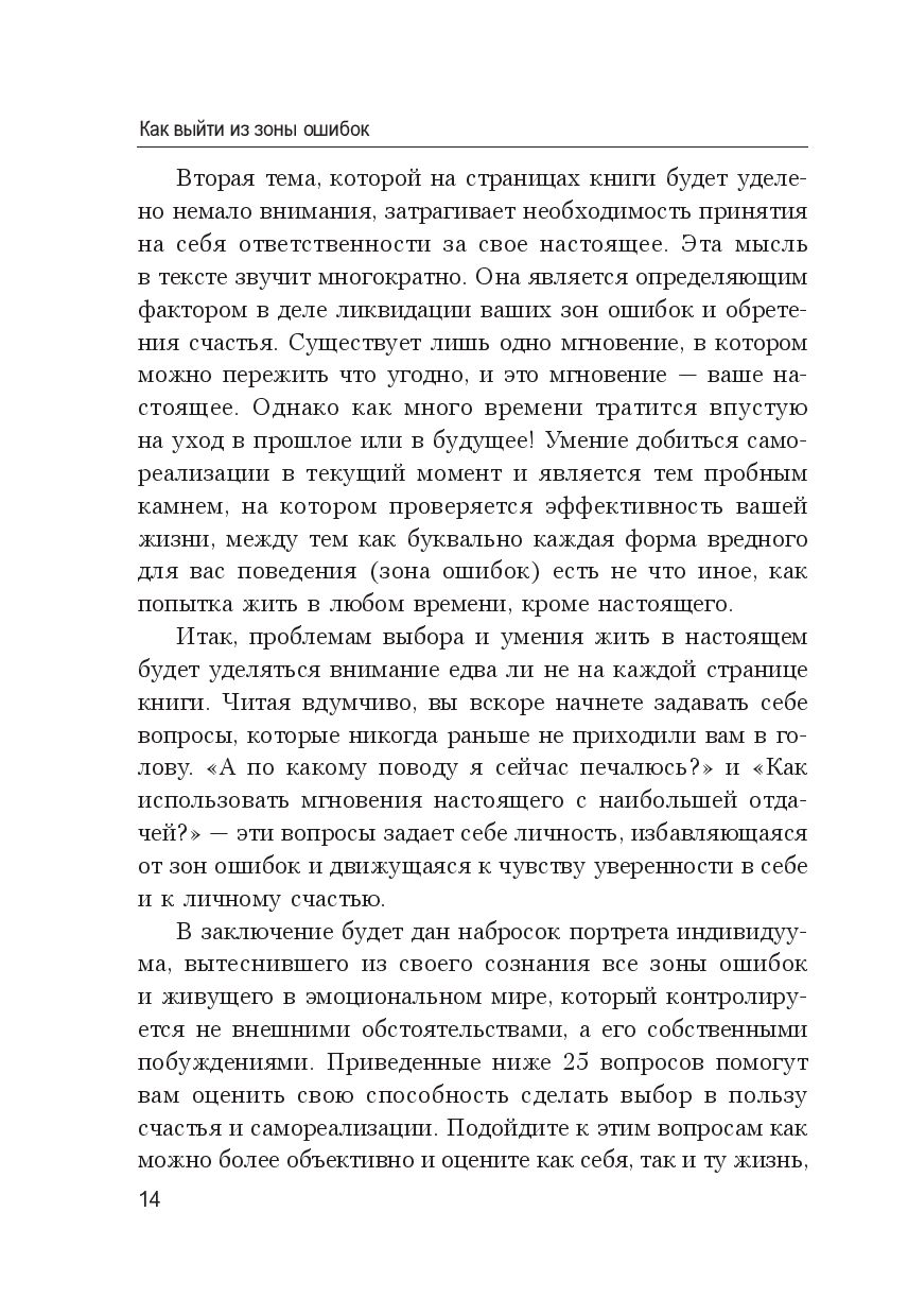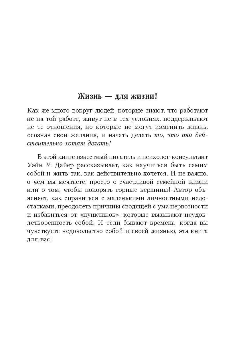 Уэйн Дайер помог тысячам людей выявить их зоны ошибок и научиться обходить ловушки мышления, приводящие к неудовлетворенности собой. Если вы хотите поднять самооценку, стать уверенными в себе и счастливыми, эта книга перевернёт всё ваше мировоззрение, научит любить самих себя такими, какие вы есть, и получать от жизни только радость и удовольствие.