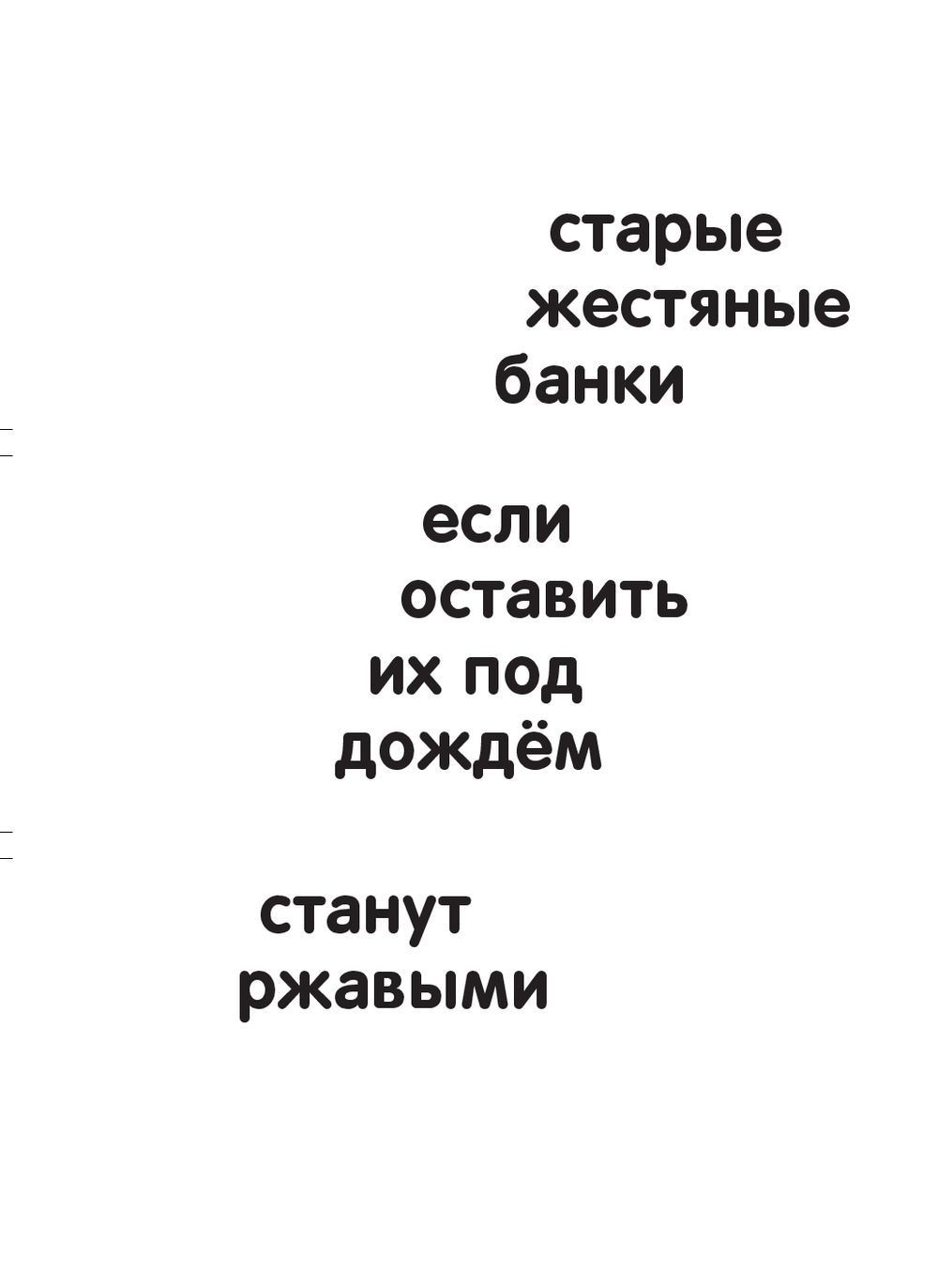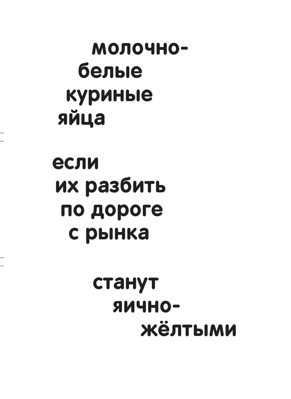 Книга-буриме – это игра со смыслами, цветами и формами. С одной стороны стихи собраны в каллиграммы, с другой – большой овал, заполненный цветными фигурами. Разрезанные на три части страницы позволяют создать 13 824 варианта неожиданных, абсурдных и смешных сочетаний текстов и форм.