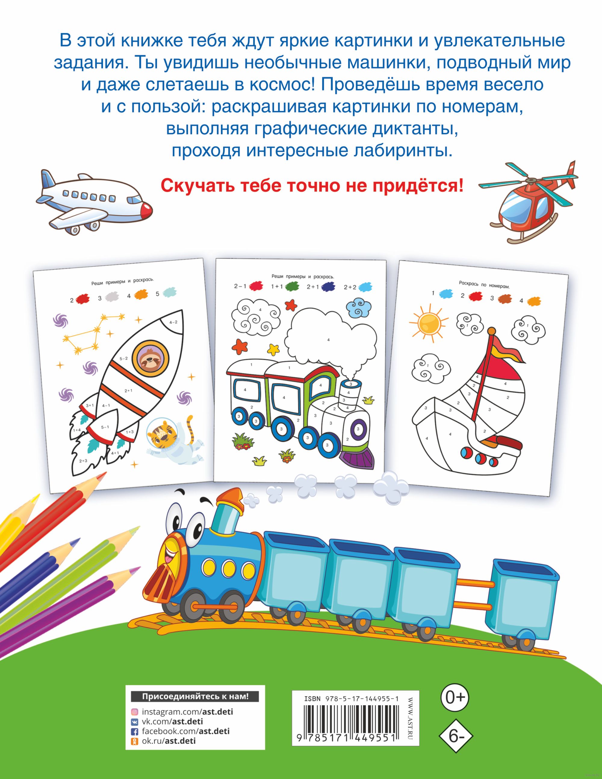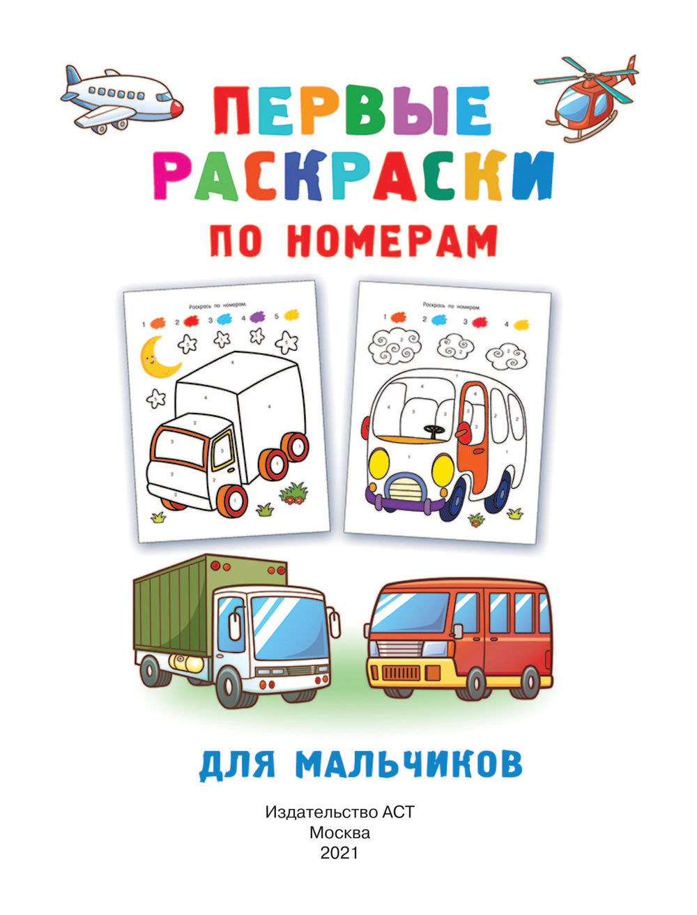 "Первые раскраски по номерам для мальчиков" - замечательная развивающая раскраска. Любознательным малышам обязательно понравится красочная коллекция головоломок и зашифрованных картинок. Предложите ребёнку раскрашивать картинки по номерам и примеры на сложение и вычитание, выполнять графические диктанты, решать логические задачки - такие интеллектуальные занятия помогают выучить счёт до 10, расширяют кругозор и словарный запас, формируют графические навыки, развивают мышление, память, внимание, наблюдательность, смекалку и творческие способности. На каждой странице иллюстрации космоса, транспорта, техники и подводного мира, а также интересные задания - ребёнок сможет заниматься самостоятельно и с удовольствием.