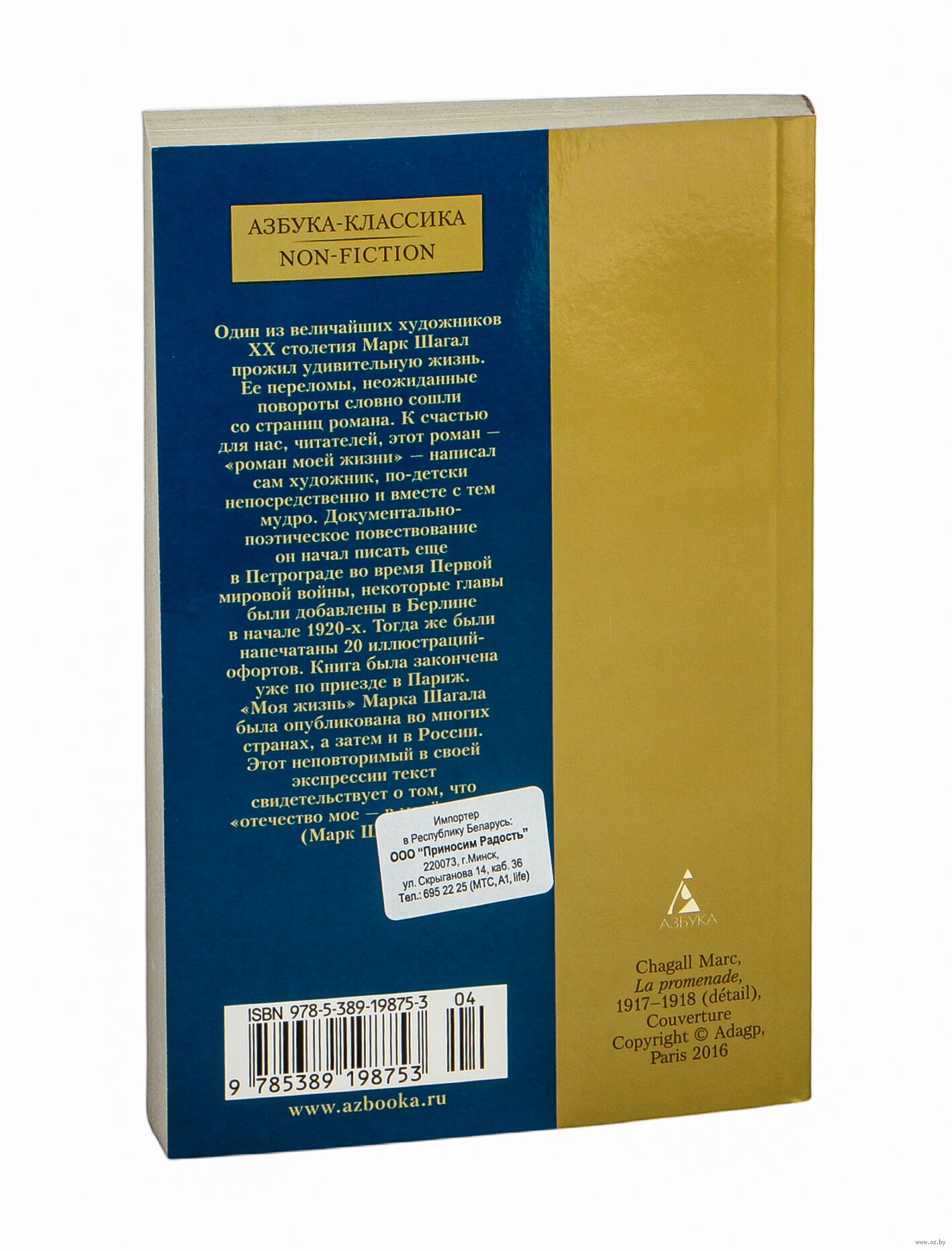 "Моя жизнь" – автобиографический роман, документально-поэтическое повествование, написанное Марком Шагалом, великим художником, чья жизнь волей исторических сдвигов разделилась между Витебском и Парижем, между Россией и Францией. Перевод на русский (исправленный для настоящего издания) принадлежит Наталье Мавлевич, лауреату премии "Мастер".